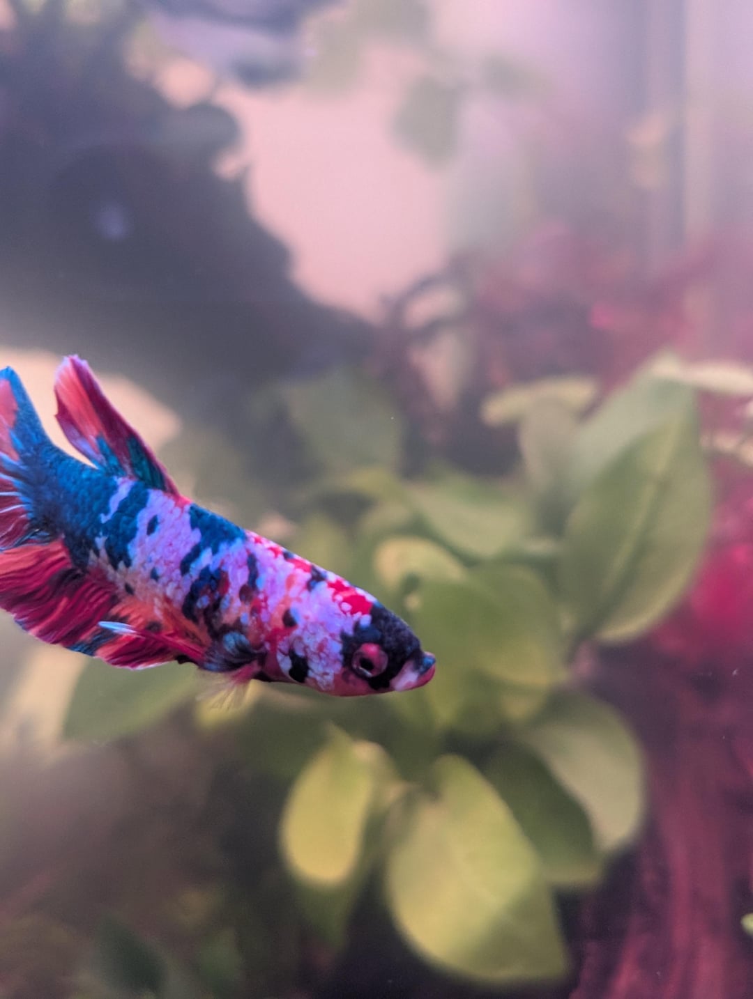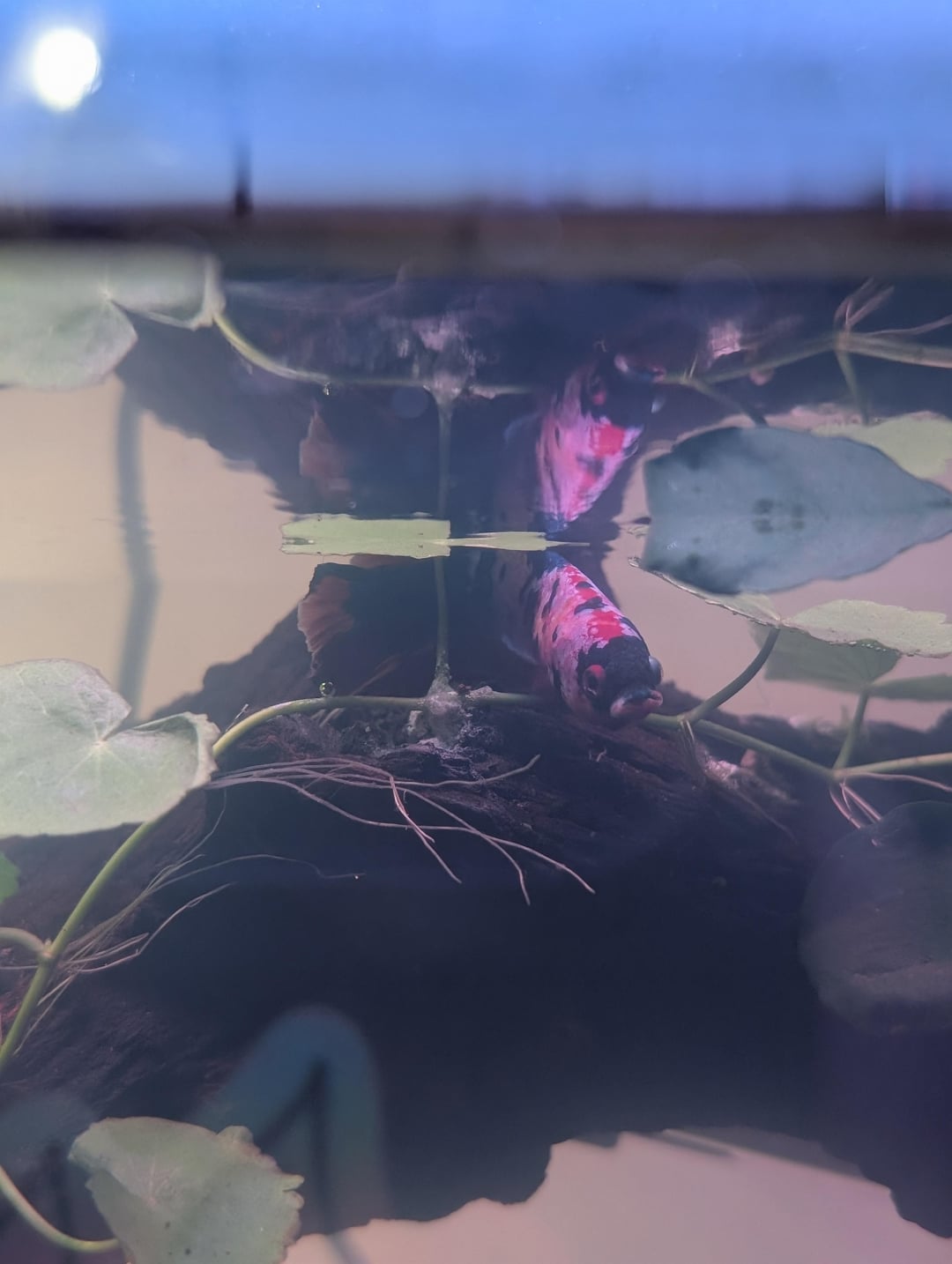 Got this beautiful plakat koi today, has some green/red/black and white. Also has heterochromia, one blue and one red eye. Exploring his new home for the first time.