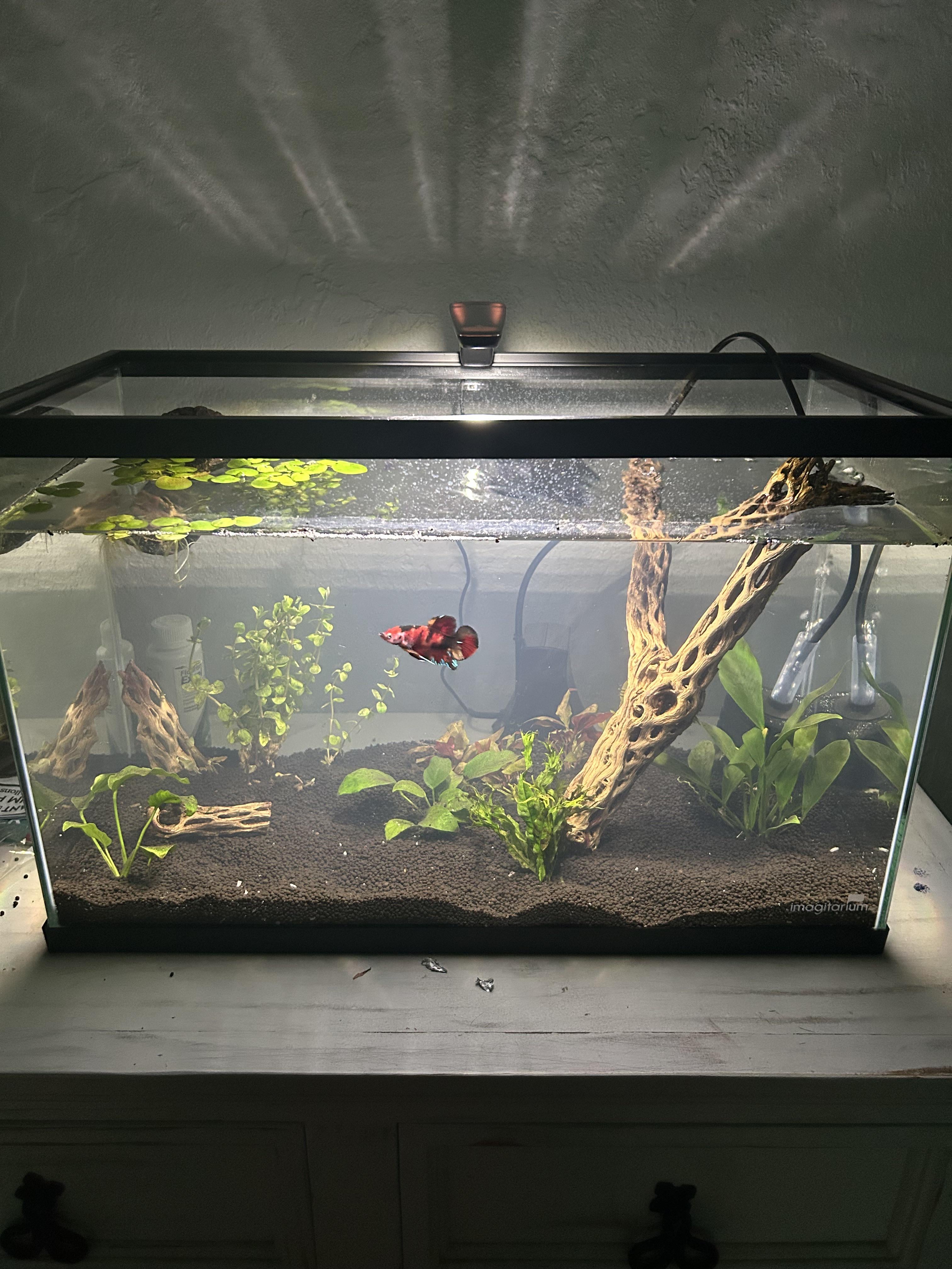 Good start! However the anubias plants are epiphytes and if you bury them like that they will die. They are best attached to hardscapes. The cholla wood can also be very risky with bettas because bettas being curious dumb little fish can easily get stuck in them trying to squeeze through the holes and swim through it. I personally would take it out and swap it out for a different kind of wood.