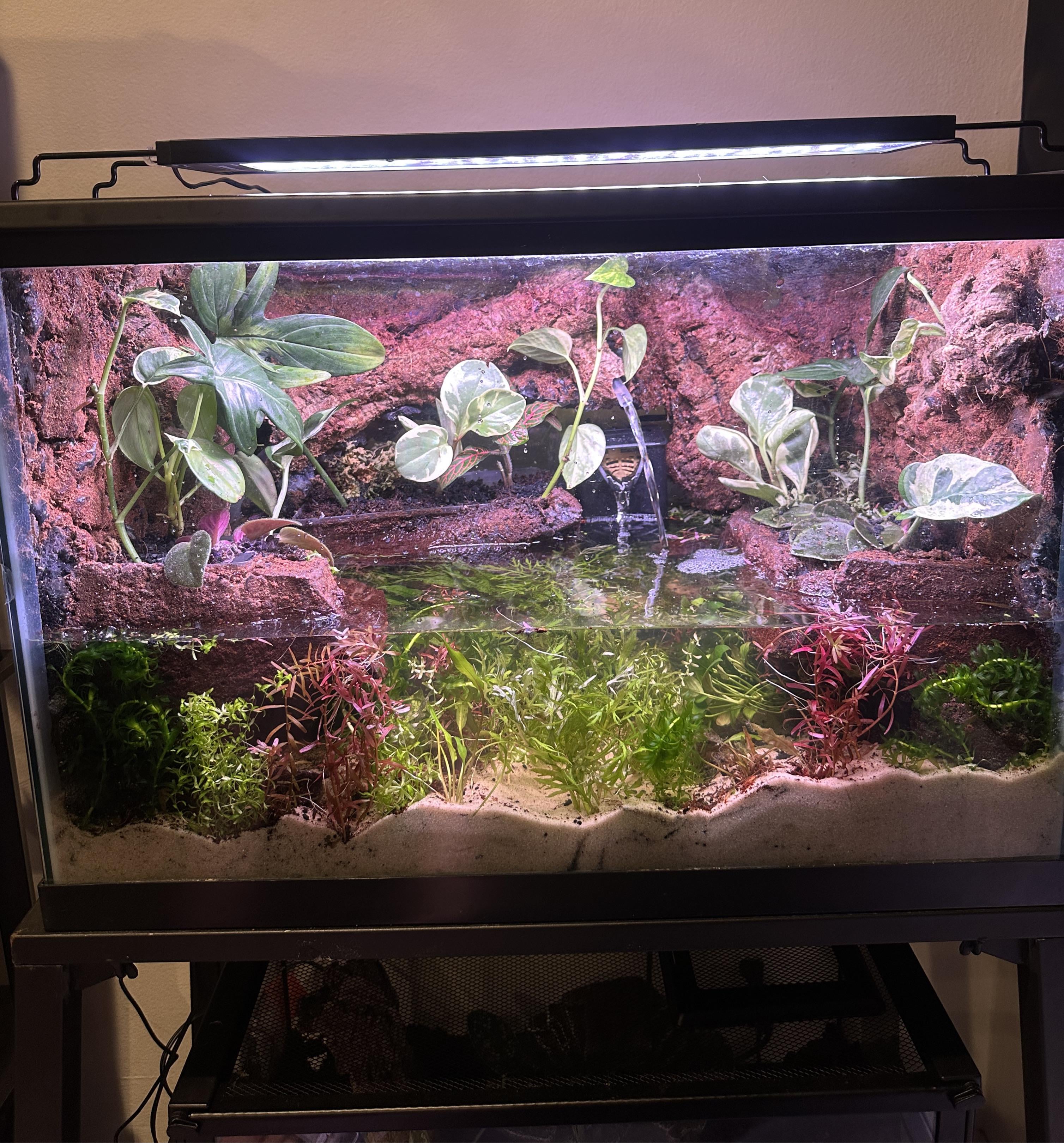 just finished setting up the plants. soon to stock fish. it’s about 5-6 gallons of water in the water section and i know i can put shrimp and snails, but what else can i put in there ?