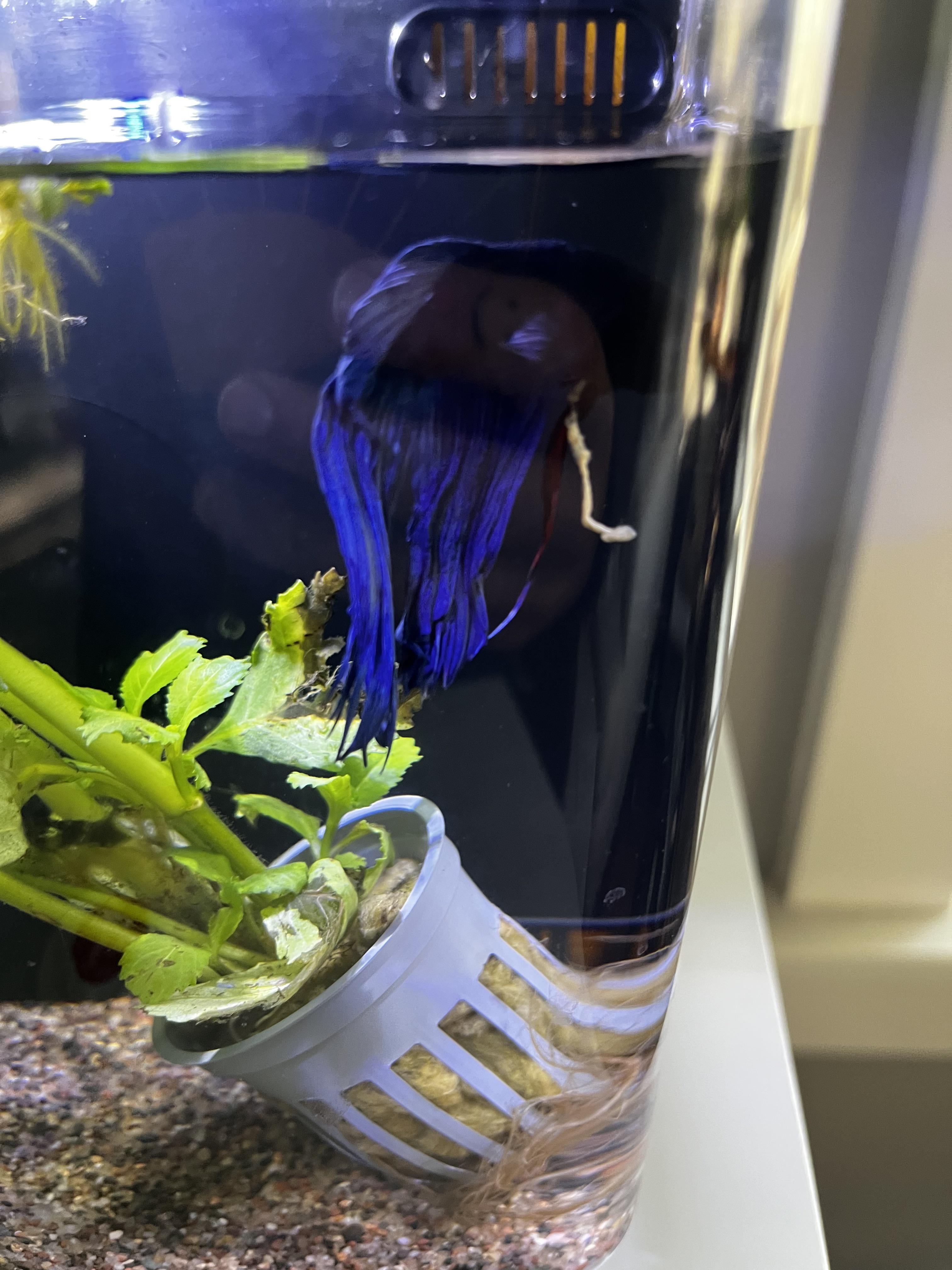 What is coming out of my fish?? This is pickle who recently injured his fin causing rot so he’s in a hospital tank. Is this poop?