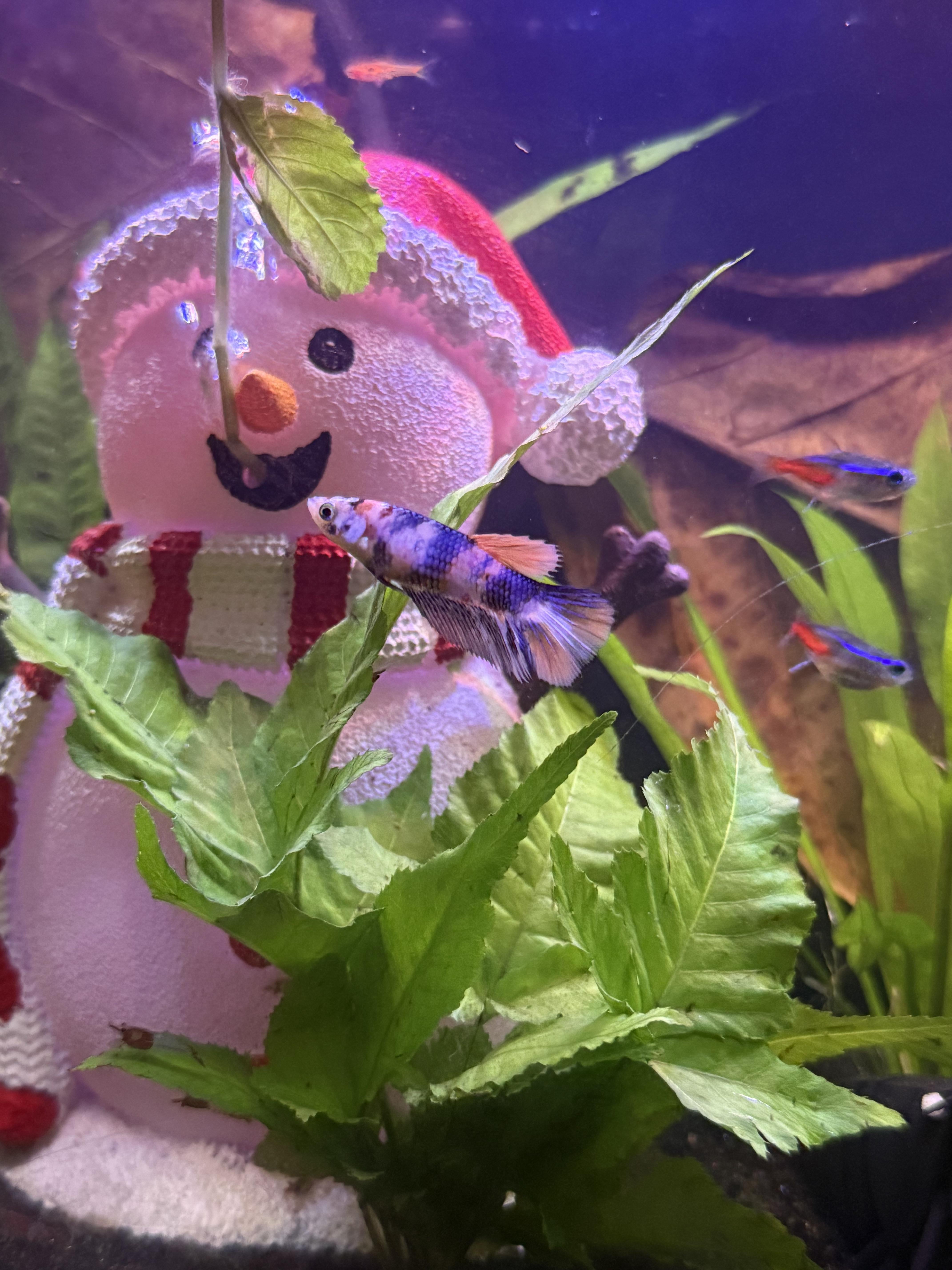 She’s housed in a 10 Gallon long with 3 tetras, 6 phoenix rasboras and 5 billion red rilli shrimp. She is doing so well. I have a 5 gallon on stand by if anything happens lol.