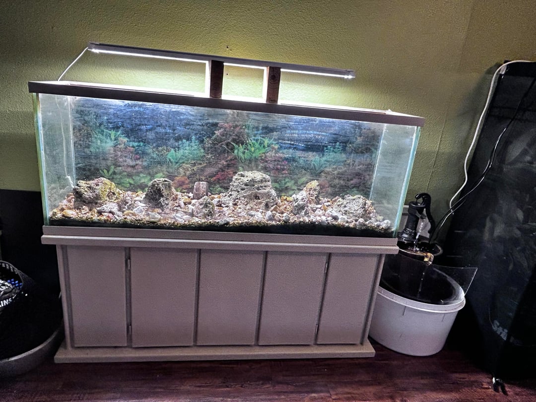 So I found this 80 gal aquarium on marketplace and the owner just wanted it gone. I picked up the next day after speaking with the owner and somehow managed to get it setup in my house by myself. The wife doesn’t normally venture into the “fish room” 20 gal long, 55 gal planted, 10 gal terrarium(feed stock for chameleon), 2-4x2x2’ screened enclosure(one just has plants/ young fruit trees, no inhabitants the other has a juvenile chameleon) so she didn’t notice until days later. I expected a reaction but she was not happy at all and even went so far as to say she wanted a divorce. She cooled down a lot after I told her I was stocking it with fish(she was thinking snake or reptiles). Anyways I’m happy it worked out because it’s well on its way now after about 10 hours of cleaning and painting. Still needs some TLC on the front glass but I expected it to be fairly nice for free! The light is on temporary 2x6s it will be suspended from the roof. I’ll post updates after I stock it in a couple weeks.