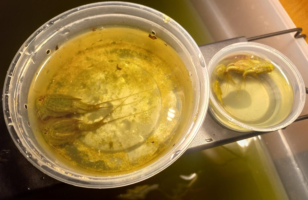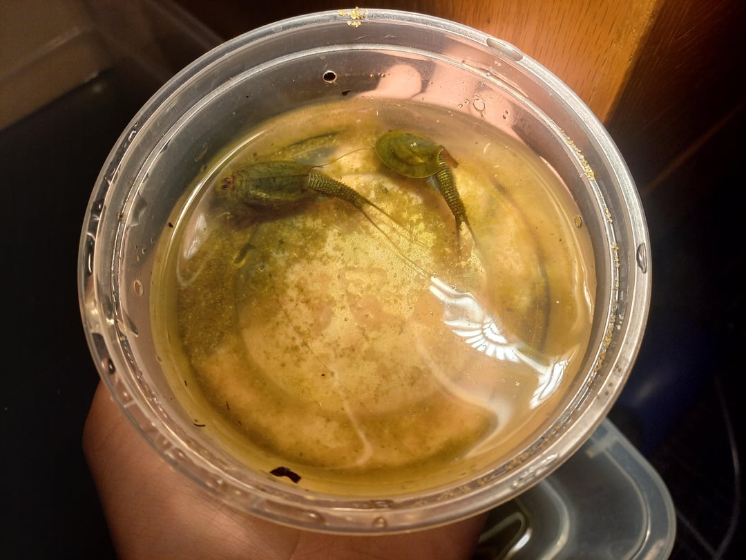 80-ish day old Triops mauritanicus 'Spanish Green' pair and their offspring that're roughly 23 days old. Currently being kept in a 16 gallon green water bin at 19°C.