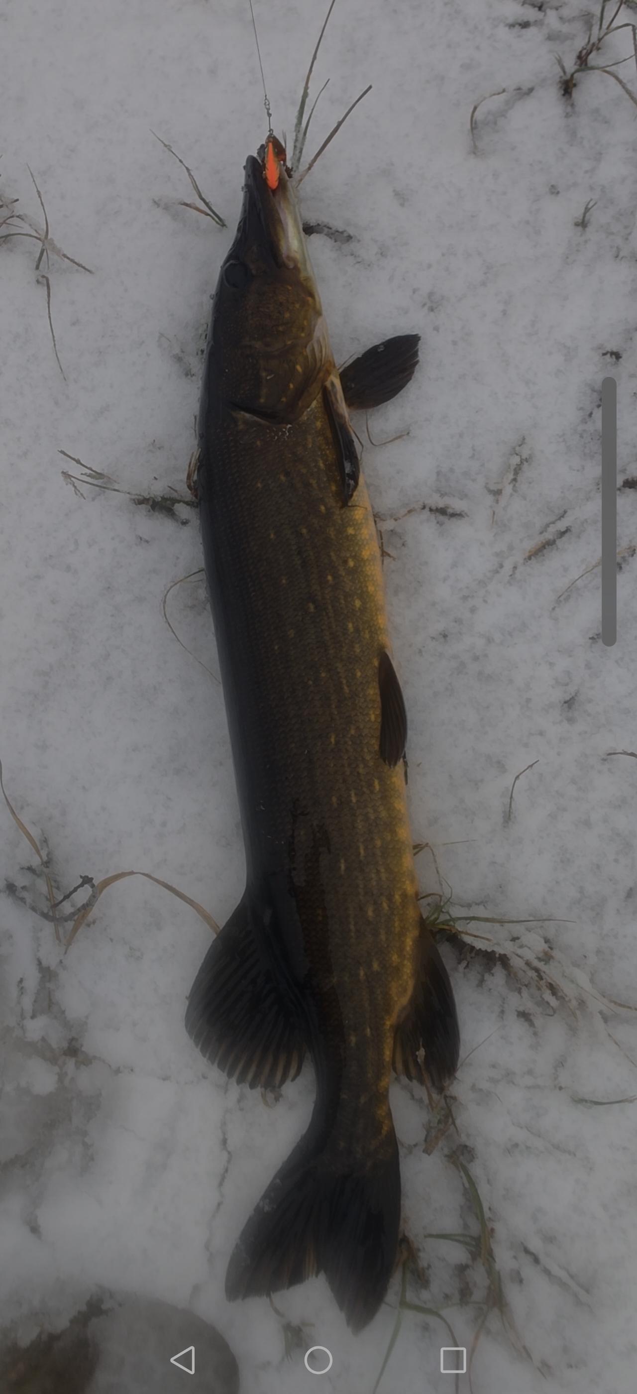 72cm beauty from my local swamp right before it freezes over. Spinner could barely penetrate the snow and ice slurry on the water. Posted by Fischmafia