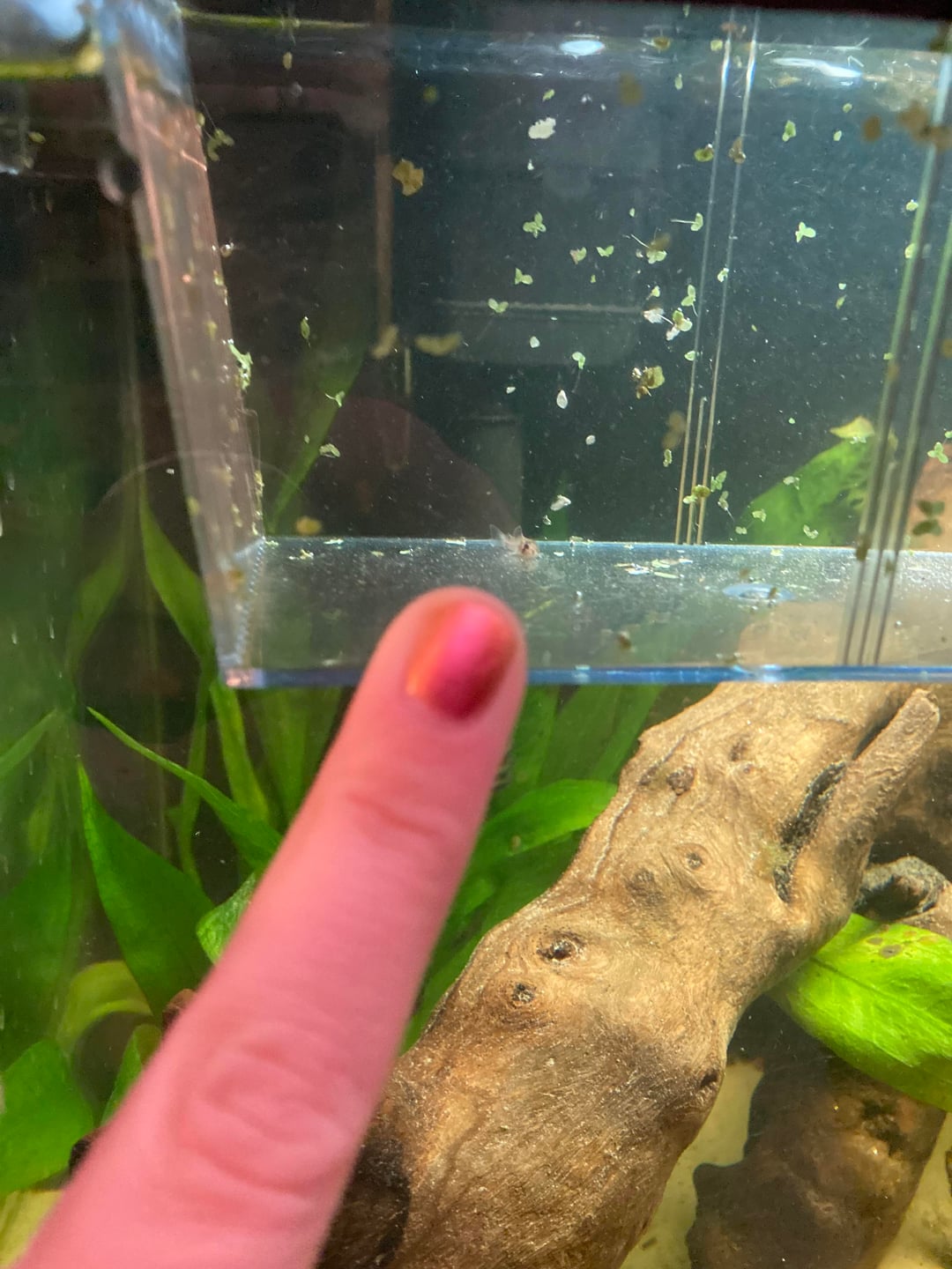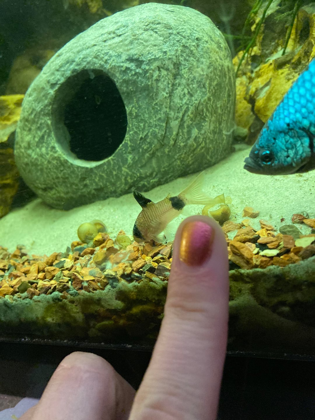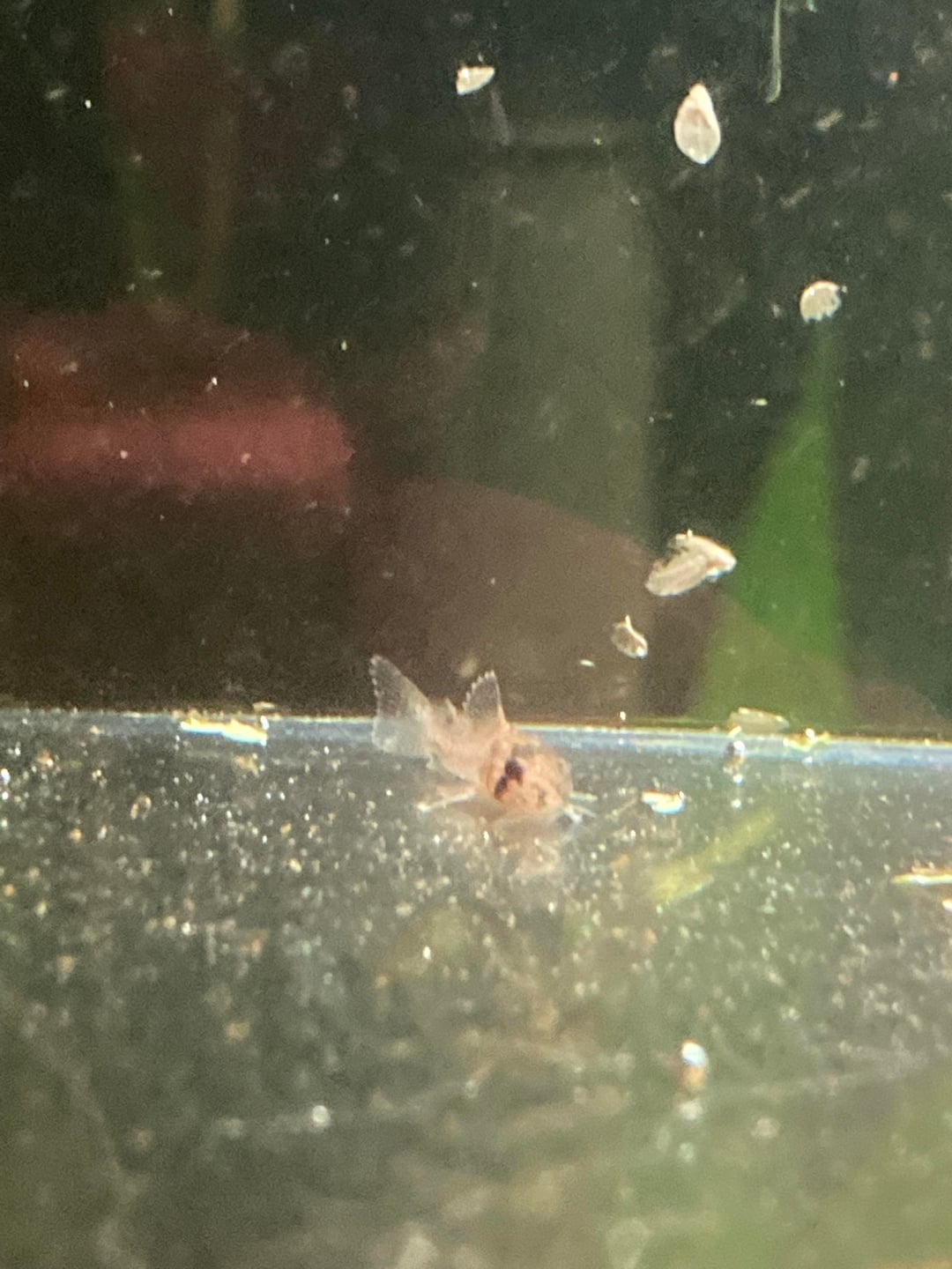 I was just sitting at my computer and looked over and saw this teeny tiny guy swimming around. I caught him and put him in my rearing chamber so my big fat betta doesn't eat him. Now i'm wondering if that's why my betta has gotten so fat.. he's been eating cory fry. But i'm so excited omg