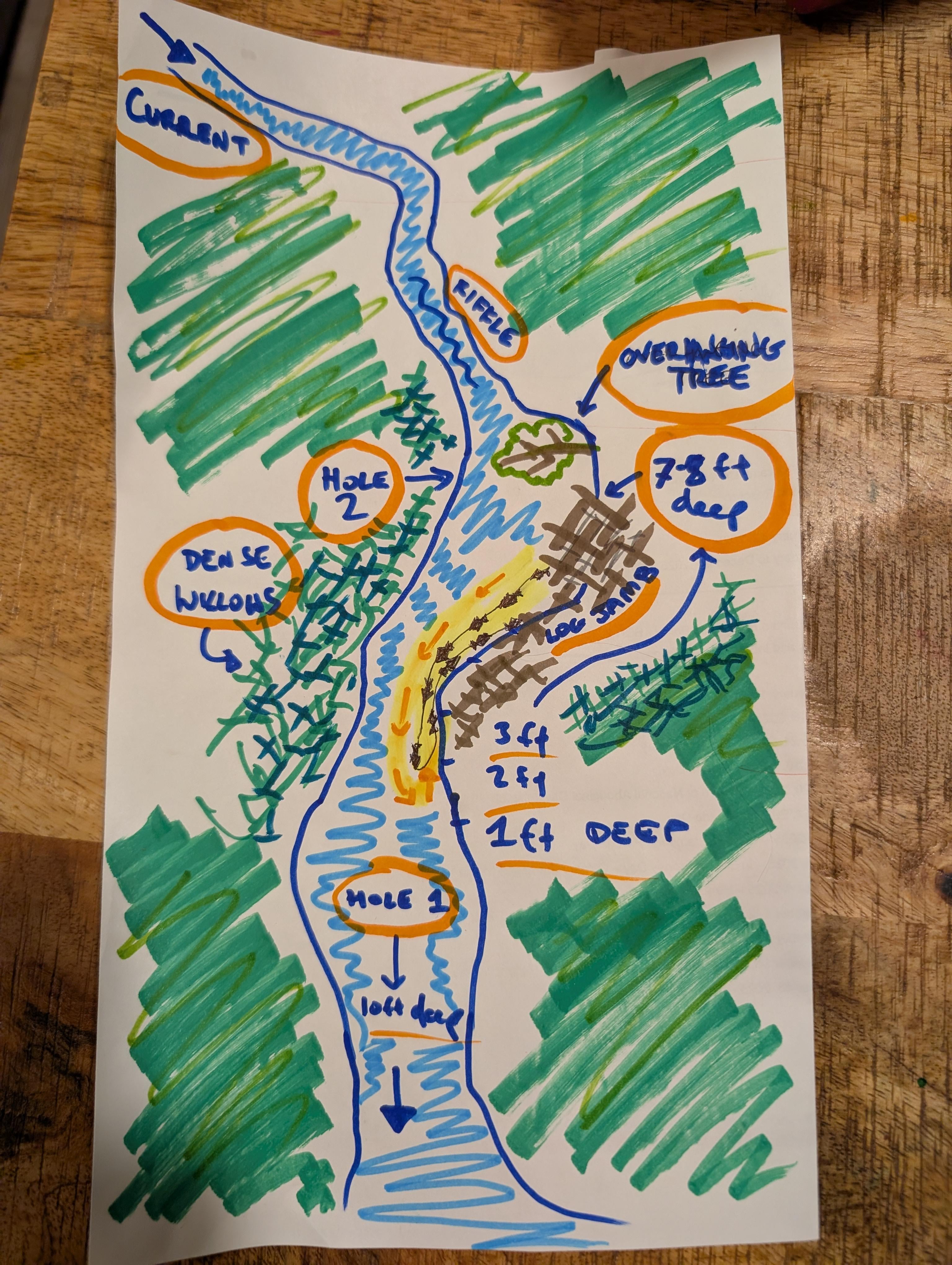 First of all pardon my sketch. Secondly, I would be grateful for any suggestions on how I might approach this specific area (Hole 2) where a school of wary trout are circulating around the highlighted loop.