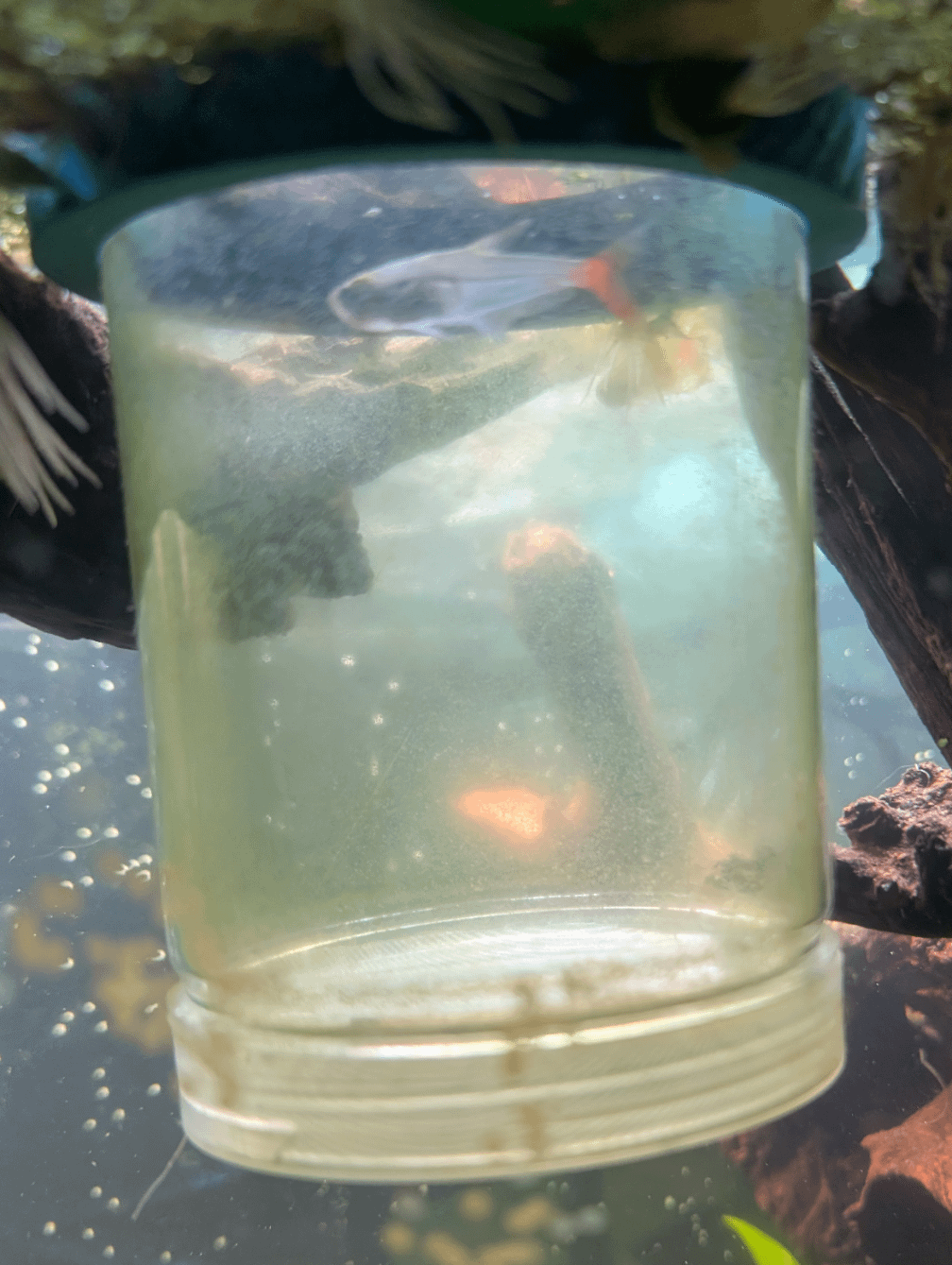I hatched some corycats in this baby keeper and this tetra keeps finding his way into it, how? Please excuse the algae, I'll give it a scrub when the babies are big enough to not be eaten by their parents.