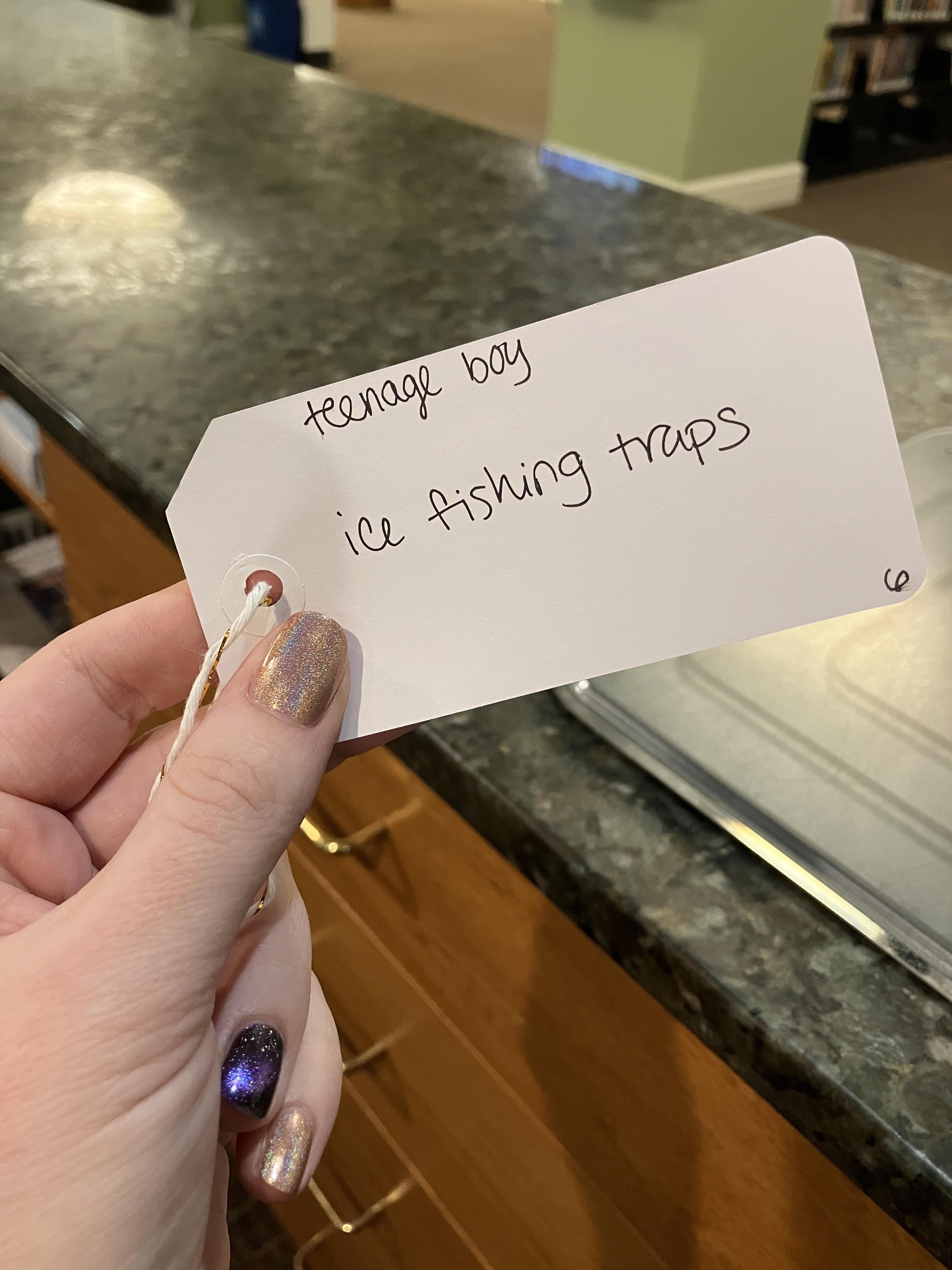 Hi Reddit Ice Fishing! The library where I work is doing a "giving tree" gift drive for families in need in our community. I keep seeing folks put the tags for the teenage boys back, especially this one (it's been up for about a month and keeps getting returned to the tree).