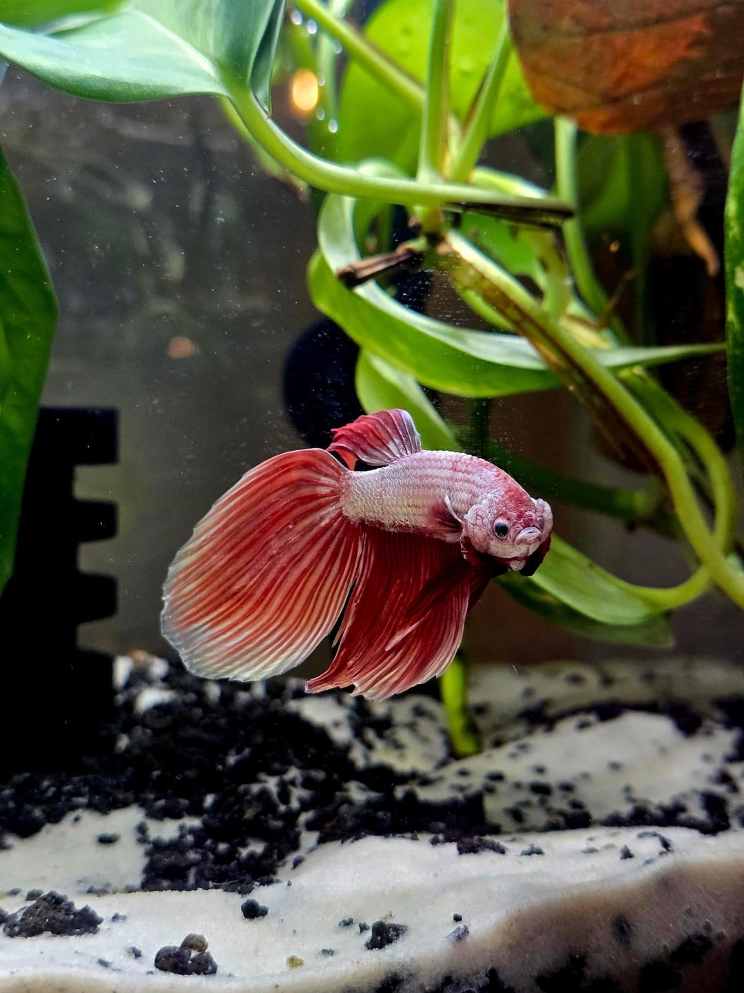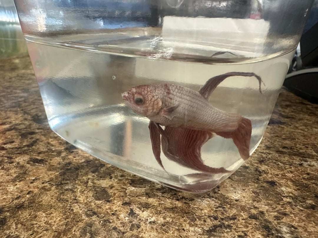 6 months in his ammonia prison and I knew if I left him there, it would only be days until he was too far gone to save. Brought him home, tested his water and I have no clue how he lived as long as he did. He really is a miracle. Both eyes were completely glazed over and he had some sort of infection or burn on the top of his head and mouth. After allowing him to blossom for a few days I believe he may have some dragonscale influence, his right eye has mostly cleared but the left is still hazy. He can not grab any food live or frozen while it’s falling but he can get it from the bottom which leads me to believe he may be partially blind and no amount of love or antibiotics can cure it. He’s a very interesting fish and super sassy for being as close to death as he has been.