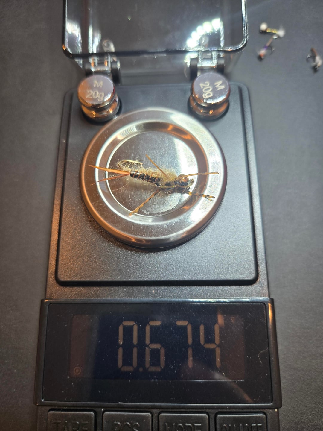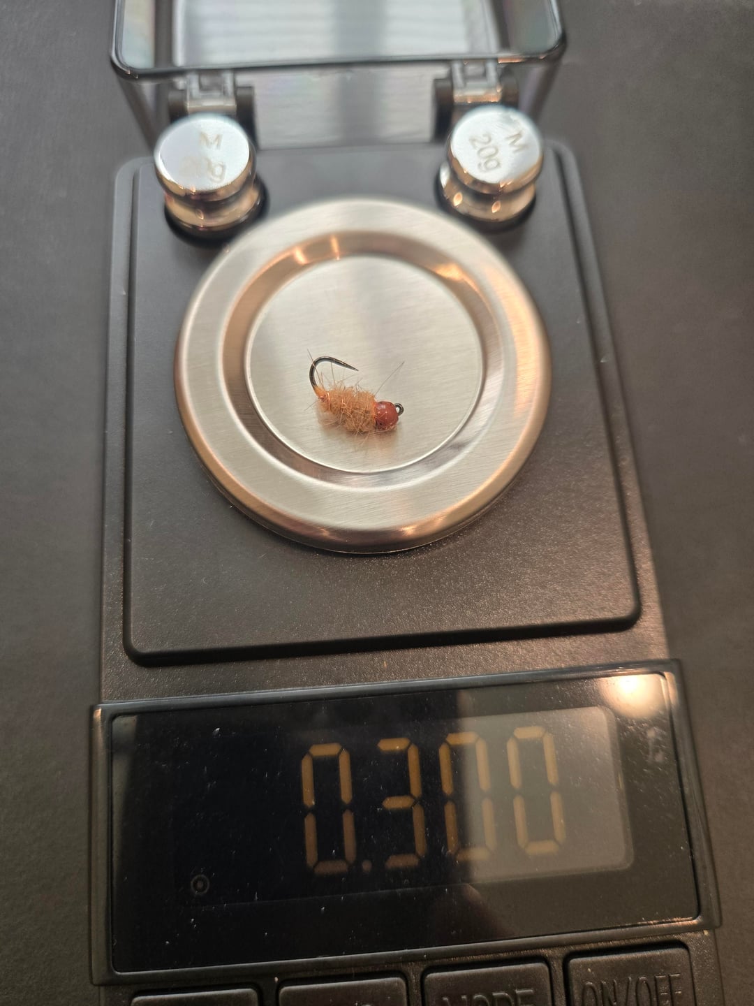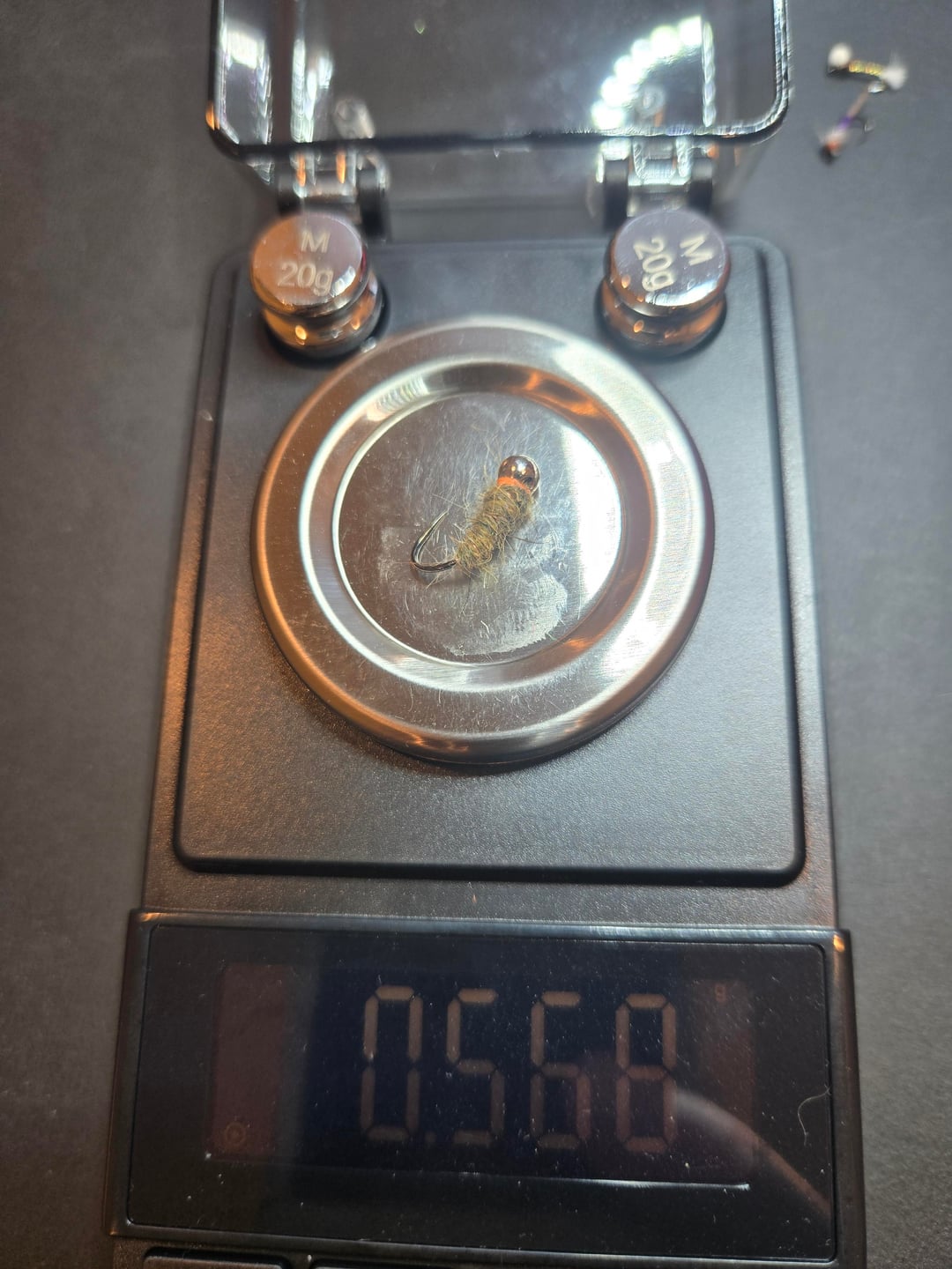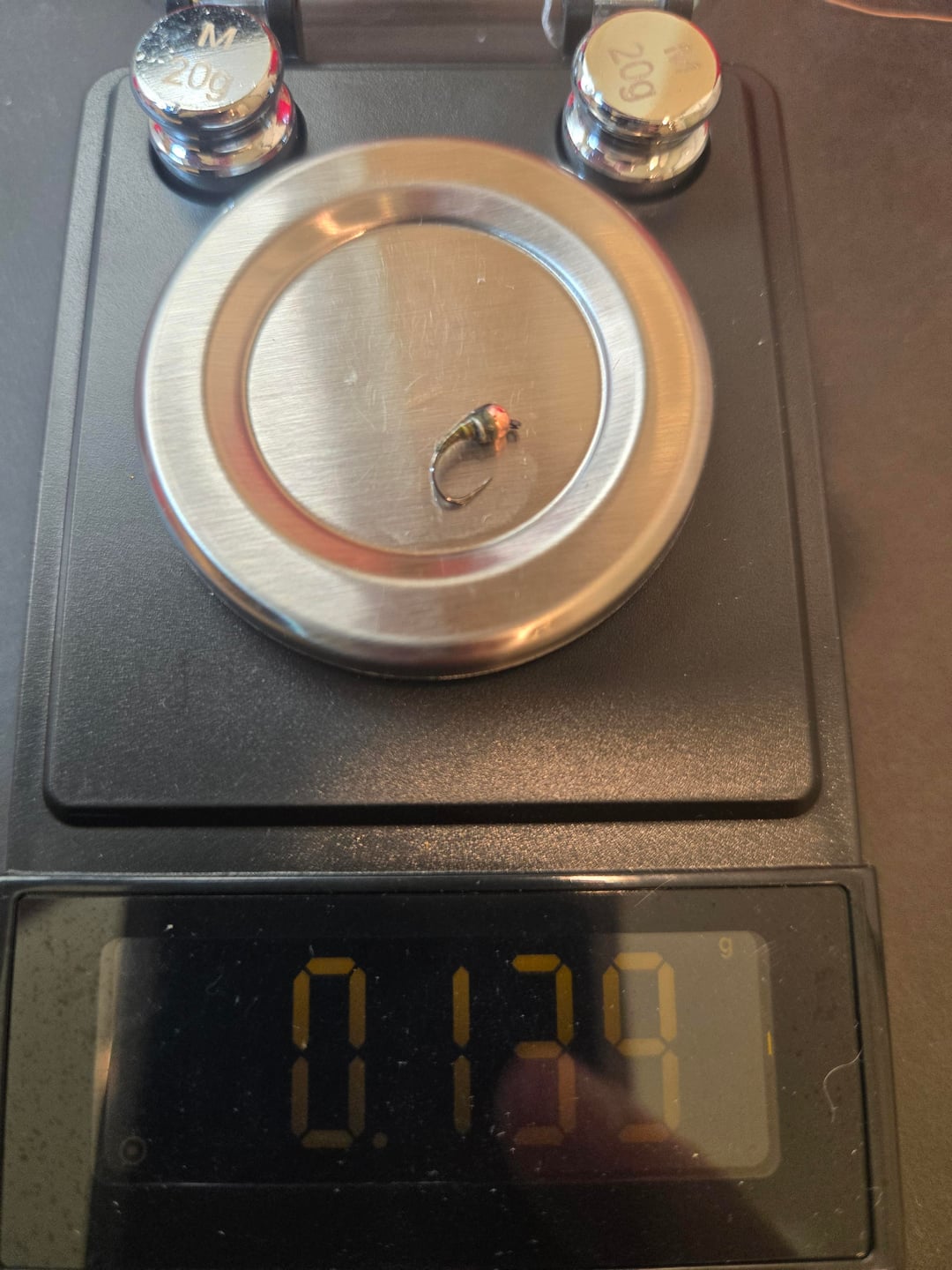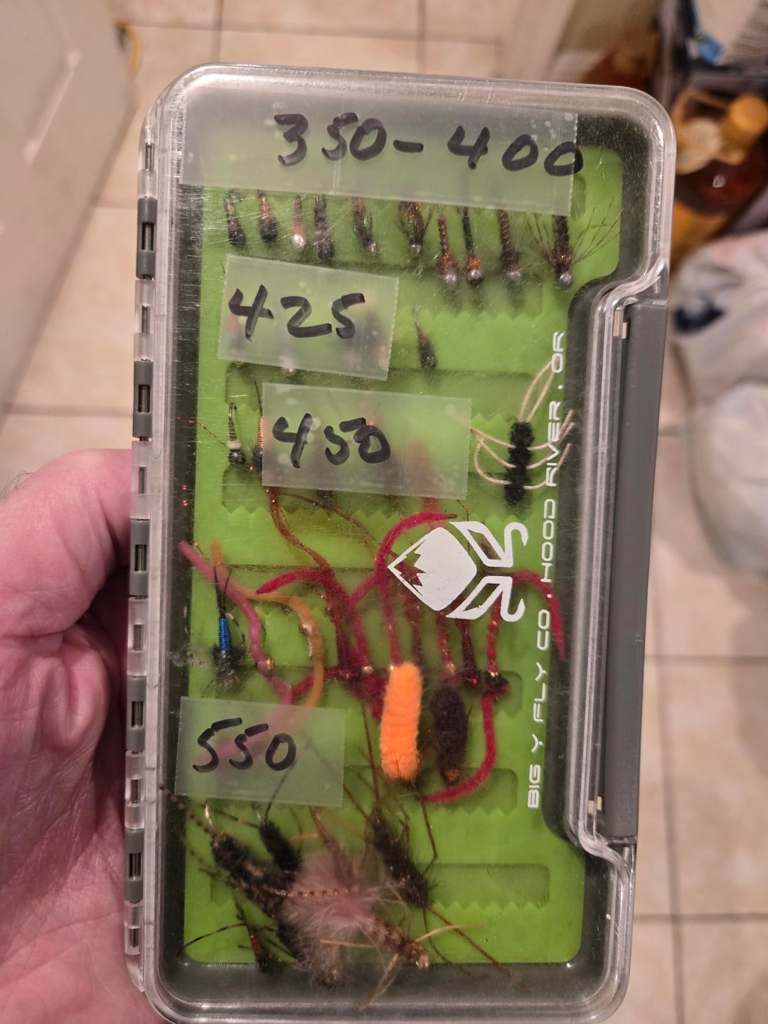 Follow up to original post. Some sample weights of various flies. Notice three similar looking midge patters, but differing weights. This helps to explain why I wanted to weigh all my flies – you cannot tell from looking how much a given fly might weigh. Weight categories/boxes range from under .025 oz to over .9 oz