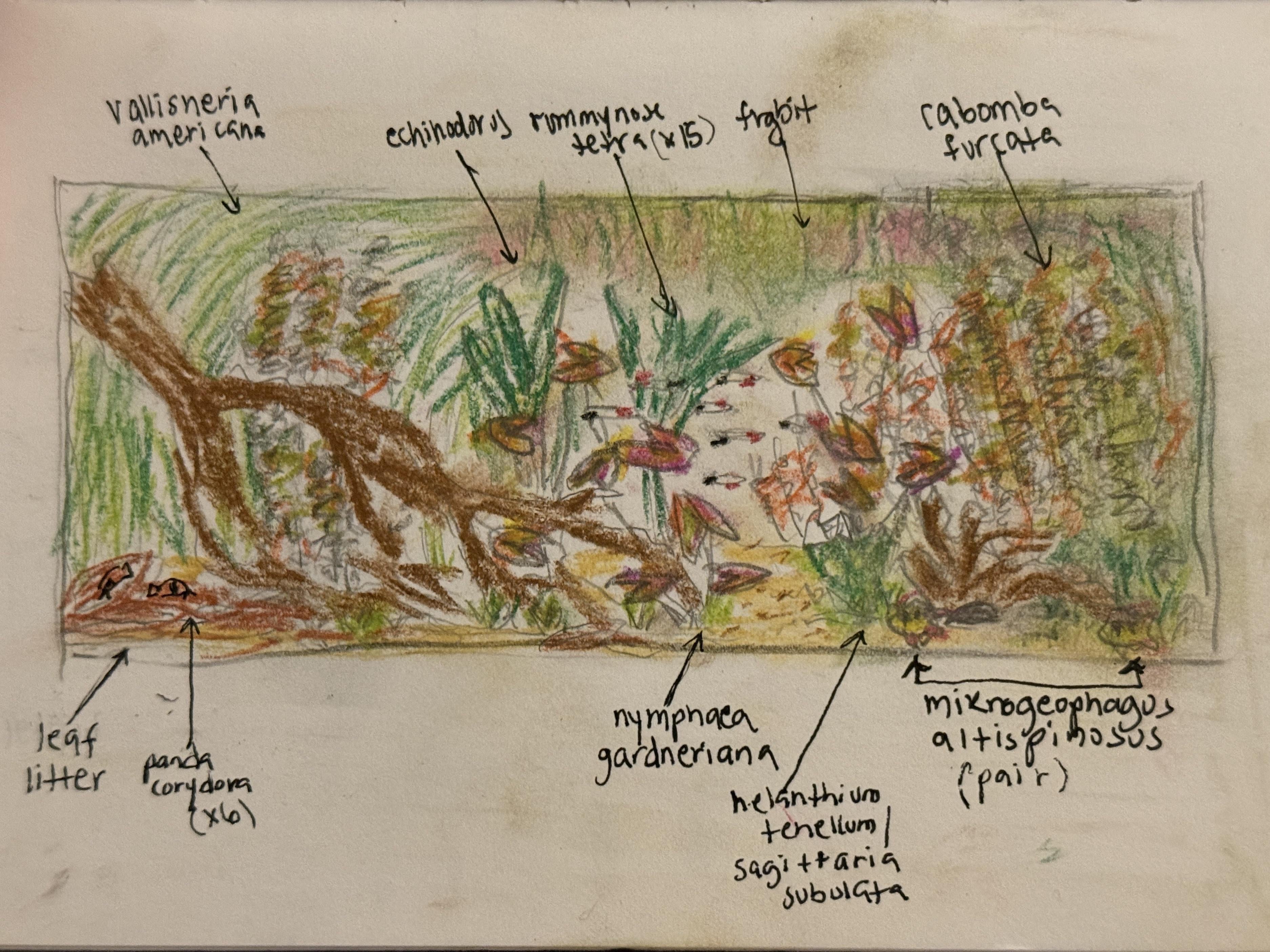 We just bought a 30 gallon long, but since I can’t scape it until we build a stand, I’m trying to scratch the itch by sketching plans. It’s not set in stone, just one idea of many. I watch a lot of Tai Streitman Biophilia, George Farmer, Oliver Lucanis, Heiko Bleher, etc. So it’s not really going to be a biotope but I want to meet the needs of the fish using inspiration from underwater footage I’ve watched and things I’ve learned.