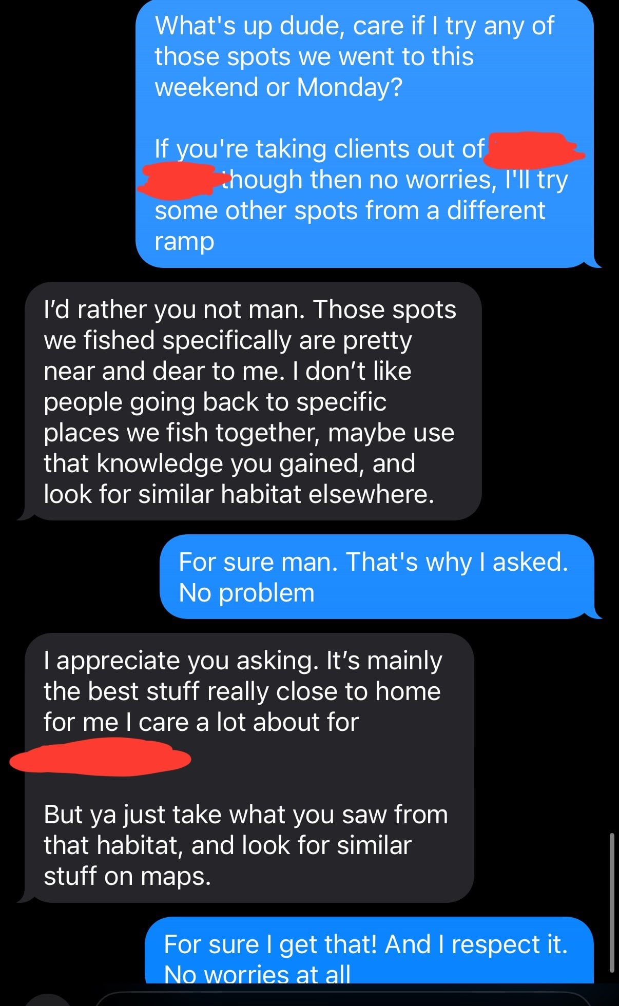 About a month later I texted him mostly out of courtesy asking if he cared if I went to any of the spots we fished so I could try fishing them on my own. Basically wanting to make sure he didn't have any client trips planned where he was going to take anybody. If that was the case I wasn't going to go there and I'd continue looking in new areas. He told me no, not to go there. Which is fine; I asked and I'm good with it. But it also just surprised me and that wasn't the answer I had expected.