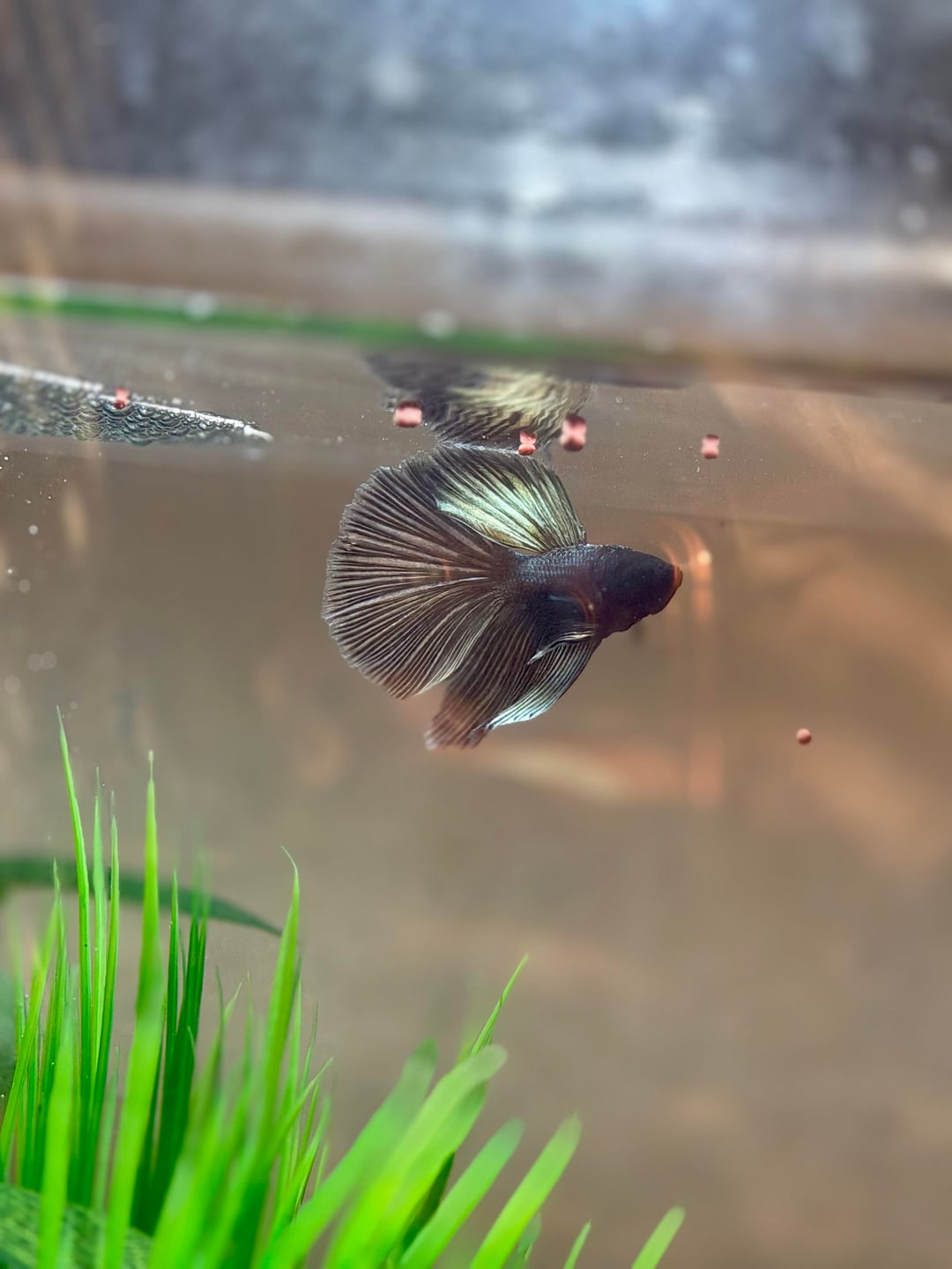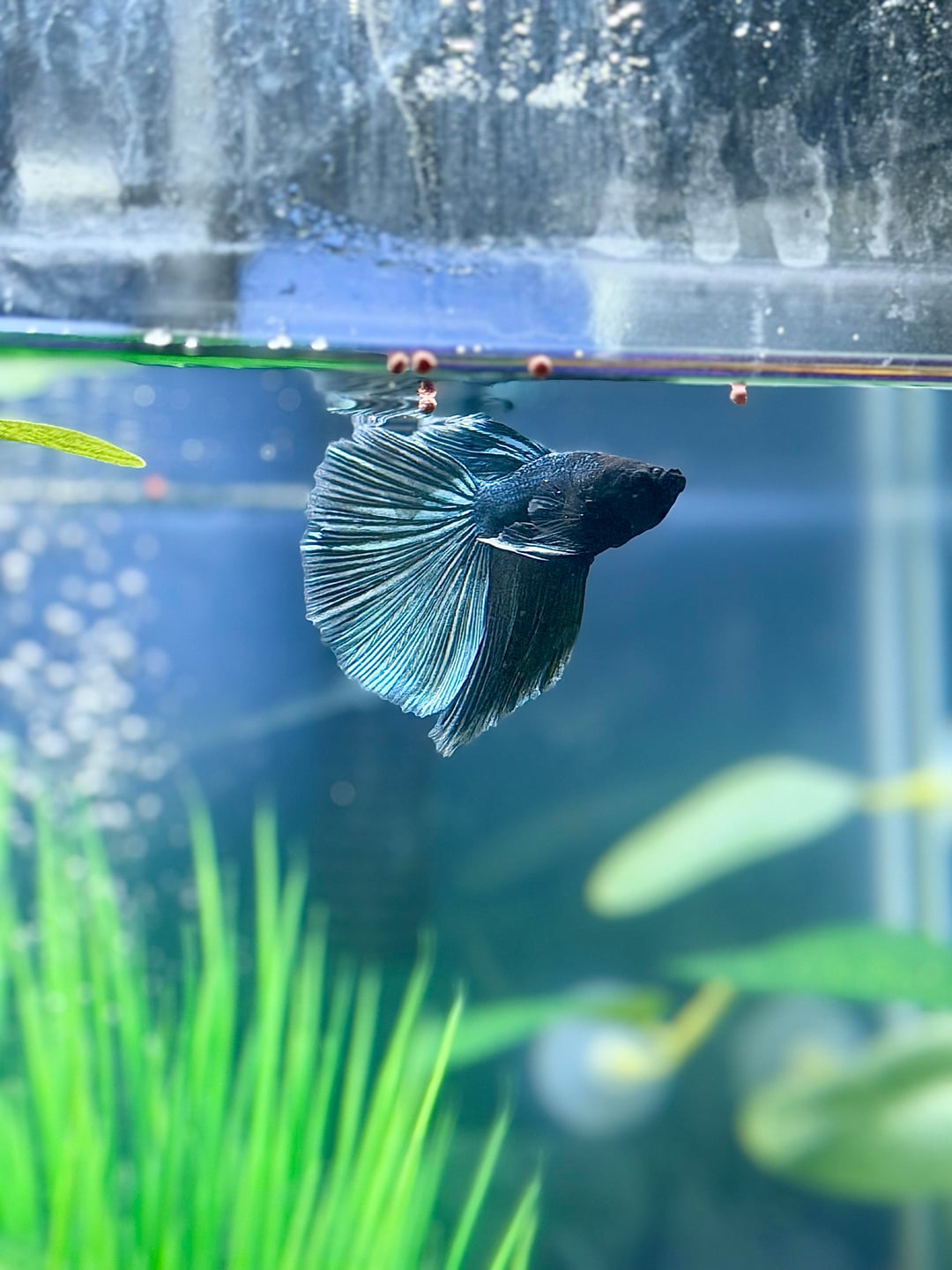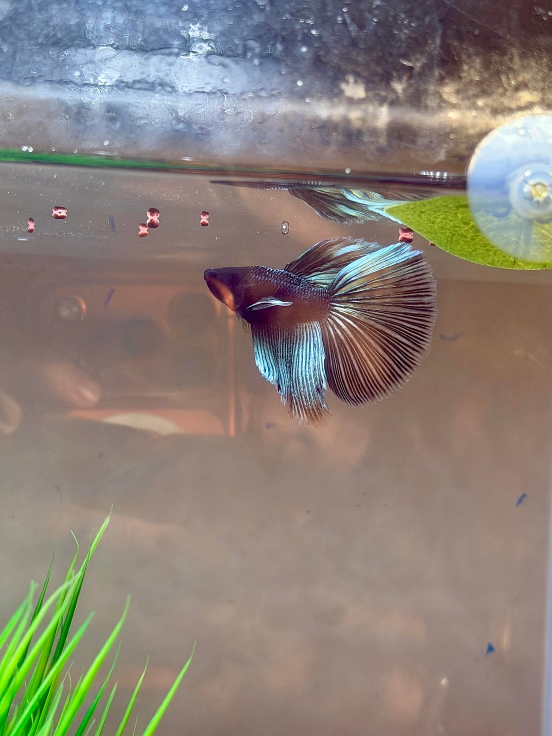 He looked so sad and pathetic fins down in his little cup, 2 weeks later he’s a whole new fish and I’m obsessed. I’ve also never seen a “bumble bee” betta with so much silver!