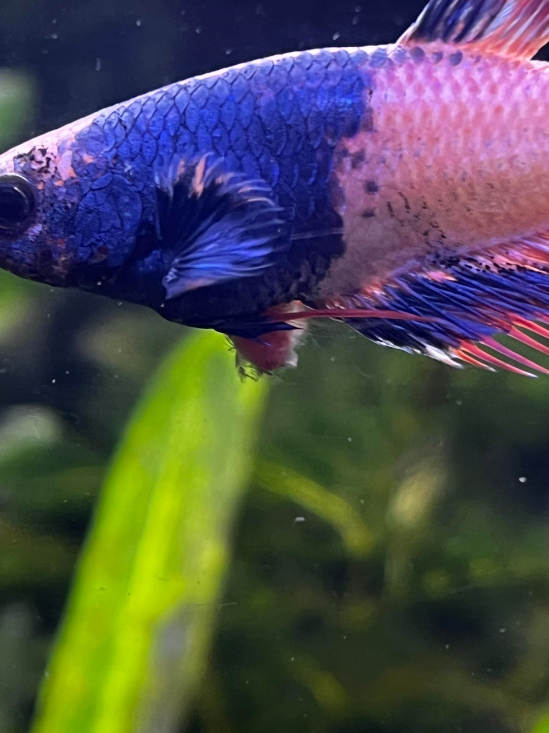 • I tried Kanaplex (3-dose cycle) + Indian almond leaves in case it was bacterial or fungal. No major improvement, so I suspected she might’ve injured herself in her previous tank (there was sharp driftwood in there).