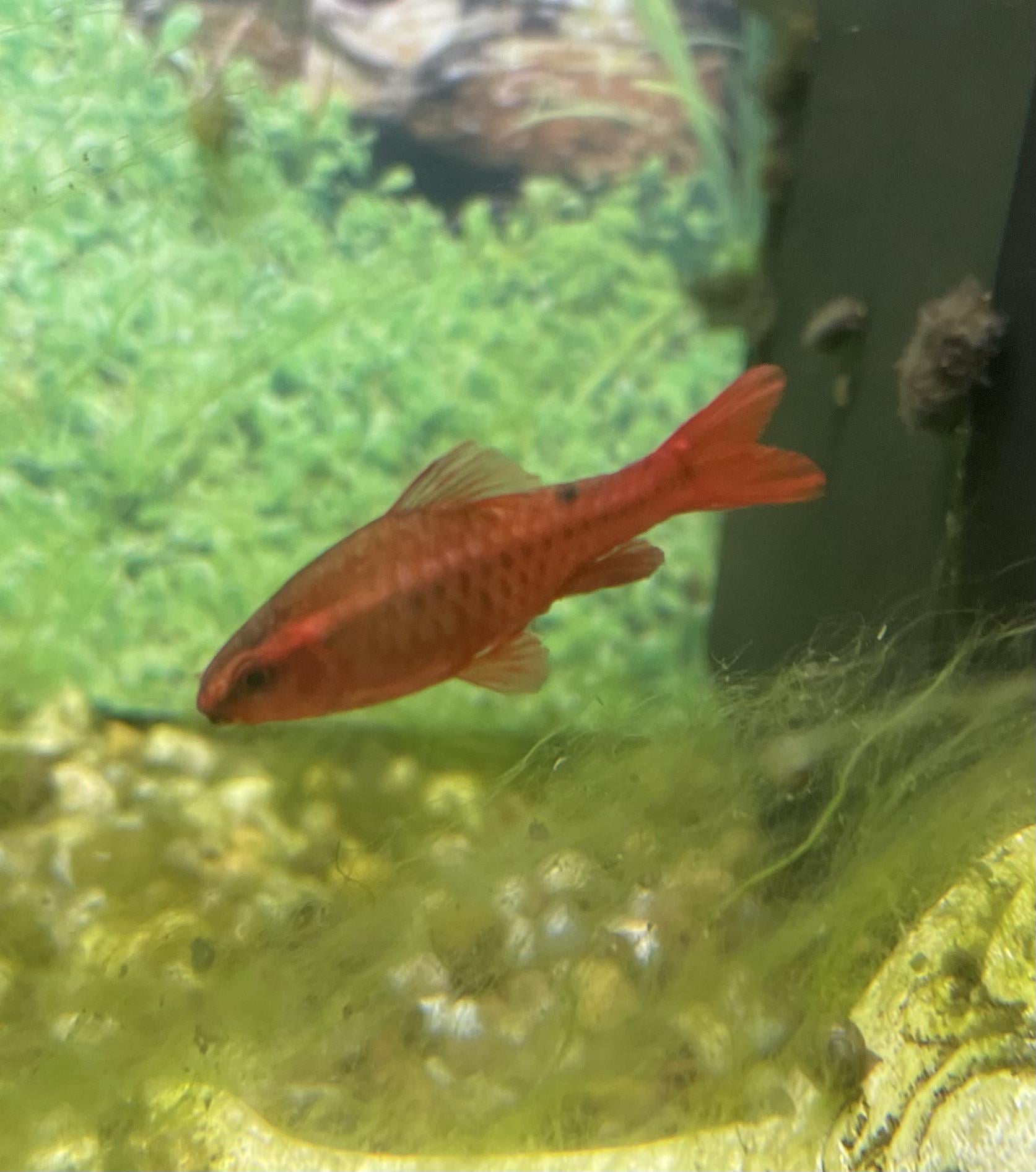 Wondering if anyone can identify this fish; about 3cm in length. We’ve basically had a large fish tank dumped on us (no maintenance for over a year, hence all the algae) with just two tiny ones of these in it and I have no idea what they are!