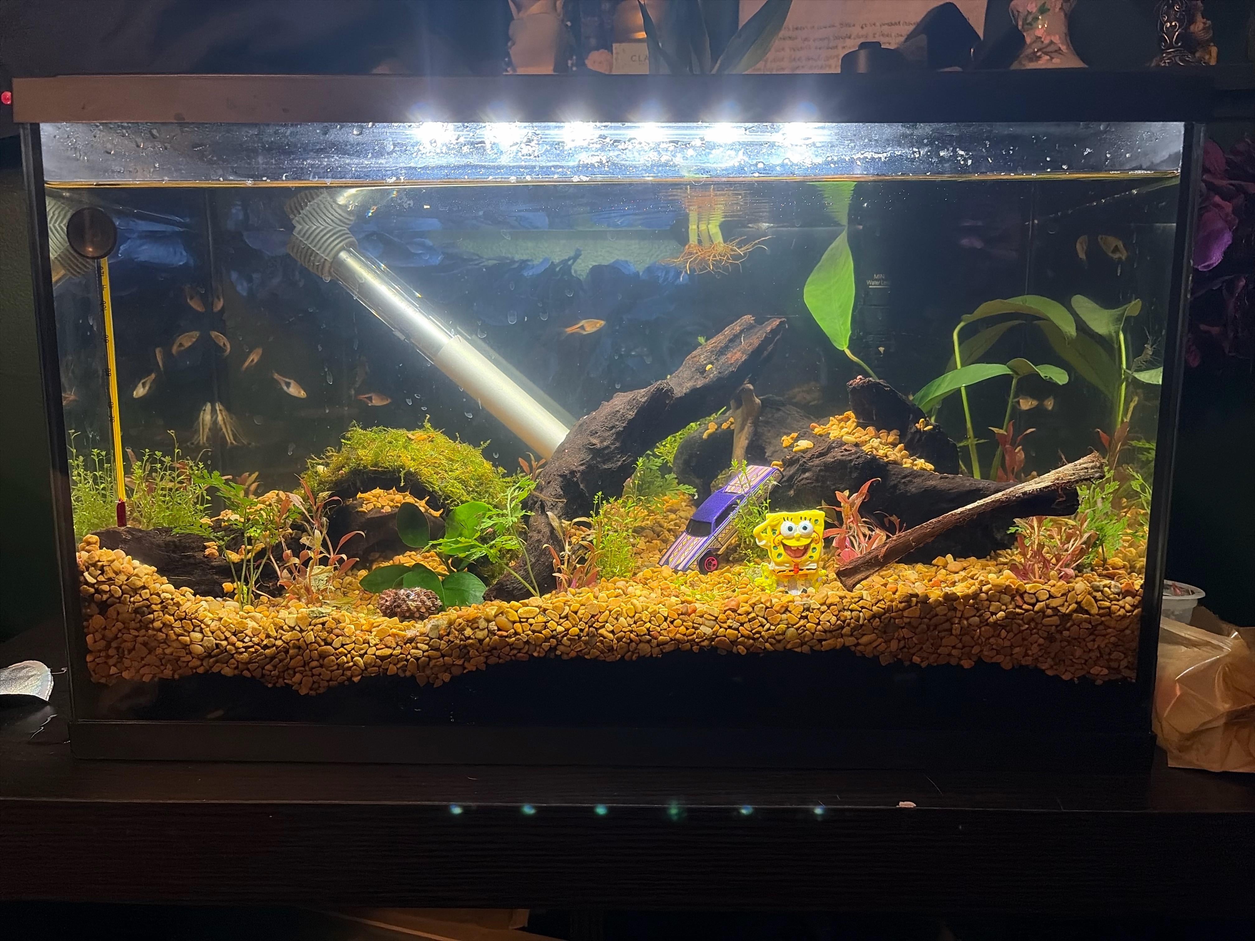 Me and my wife made this fish tank last weekend, and we wanna know if it’s overstocked or not? We have 8 harlequin rasboras, 4 Otocinclus, and then 10 ghost shrimp were insisted on lol, but I just wanted an opinion from people that are more versed in the hobby. We will take any advice/criticism, we wanna get better at the hobby, but I think this first tank isn’t that bad! (We’re planning on replacing the gravel with sand next week, we aren’t huge fans of how it looks, and we think we put too much in)