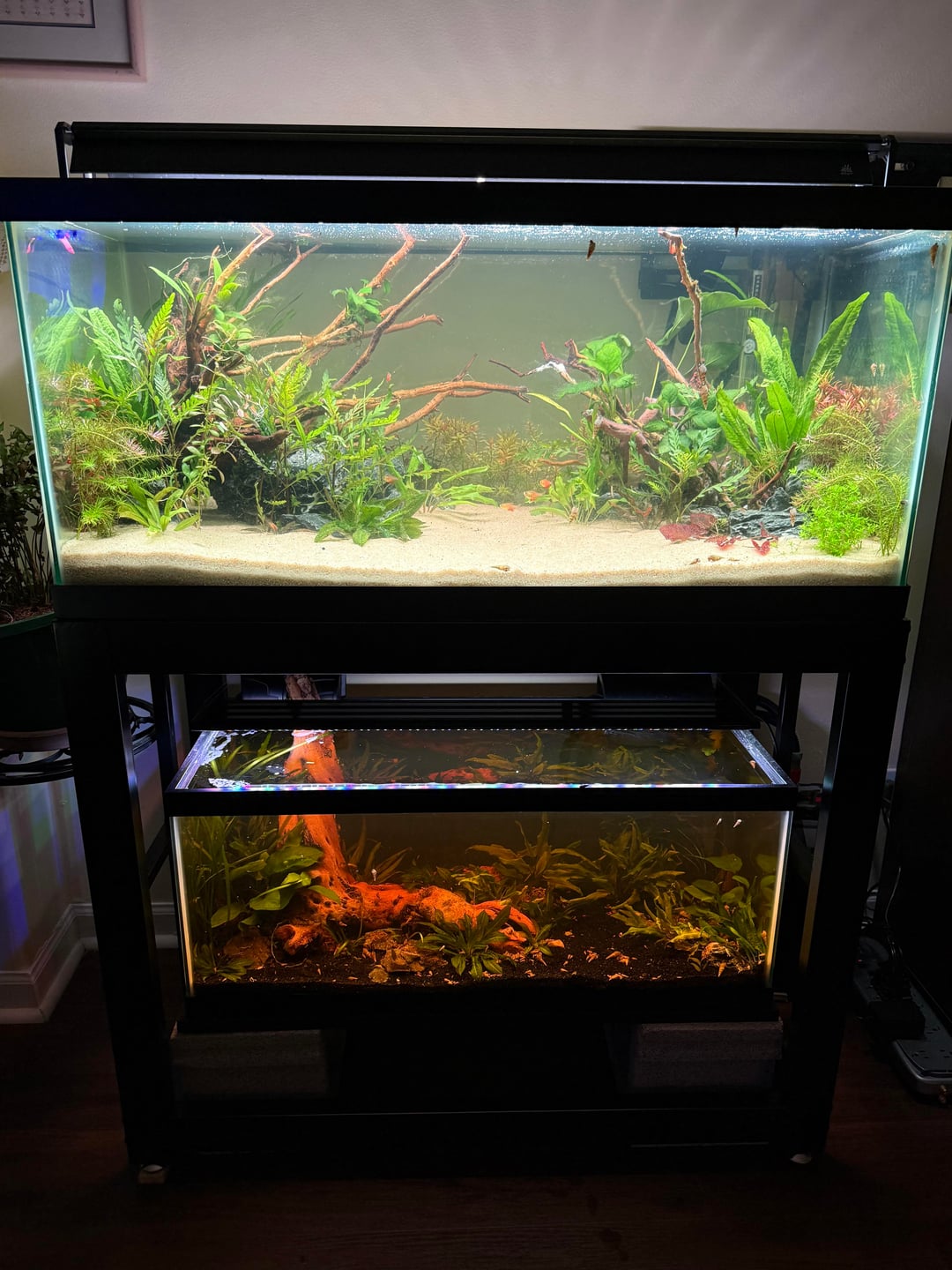 Best part about this 40 breeder stand is that the bars above have just enough room to fit some fishing wire under them, aka I hung up my 20 long light. Looks absolutely amazing and I’m so glad I followed what this Redditor did!