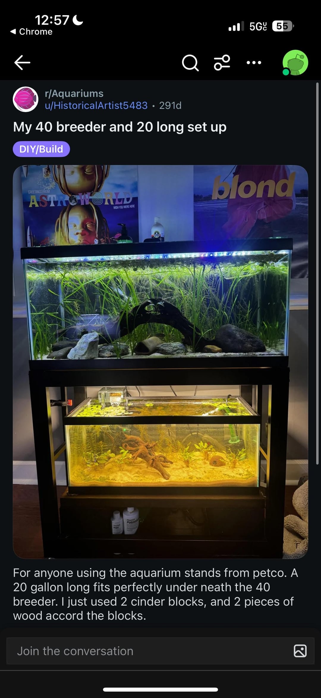 Thank you to u/historicalartist5483 because of you I was finally able to set up my 40 breeder 20 long “rack”. I swear it took me like three months of research to find a prebuilt rack that could hold a 40 & 20 ONLY, without much overhang or room for other tanks as I just wanted it for this. I stumbled across this redditor who had a 40 breeder stand that could fit a 20 long underneath it with cement blocks (which I already had on hand from a failed cement block stand idea lmfao)