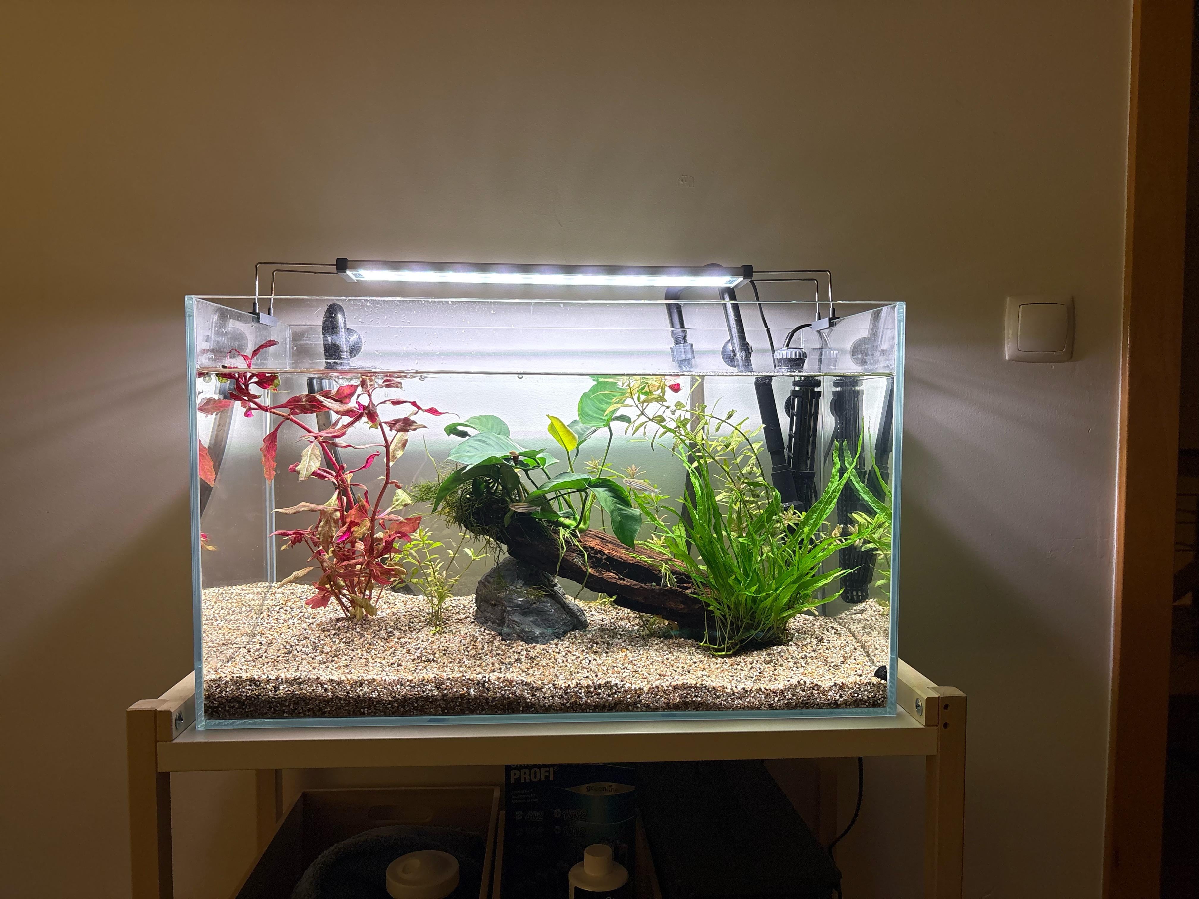 So far it’s looking great. Definitely get some more plants and some floaters and maybe some hiding spots at the front but overall it looks really great.