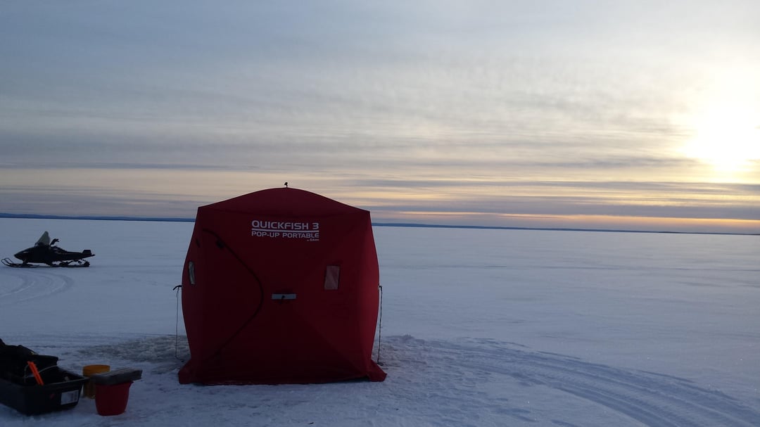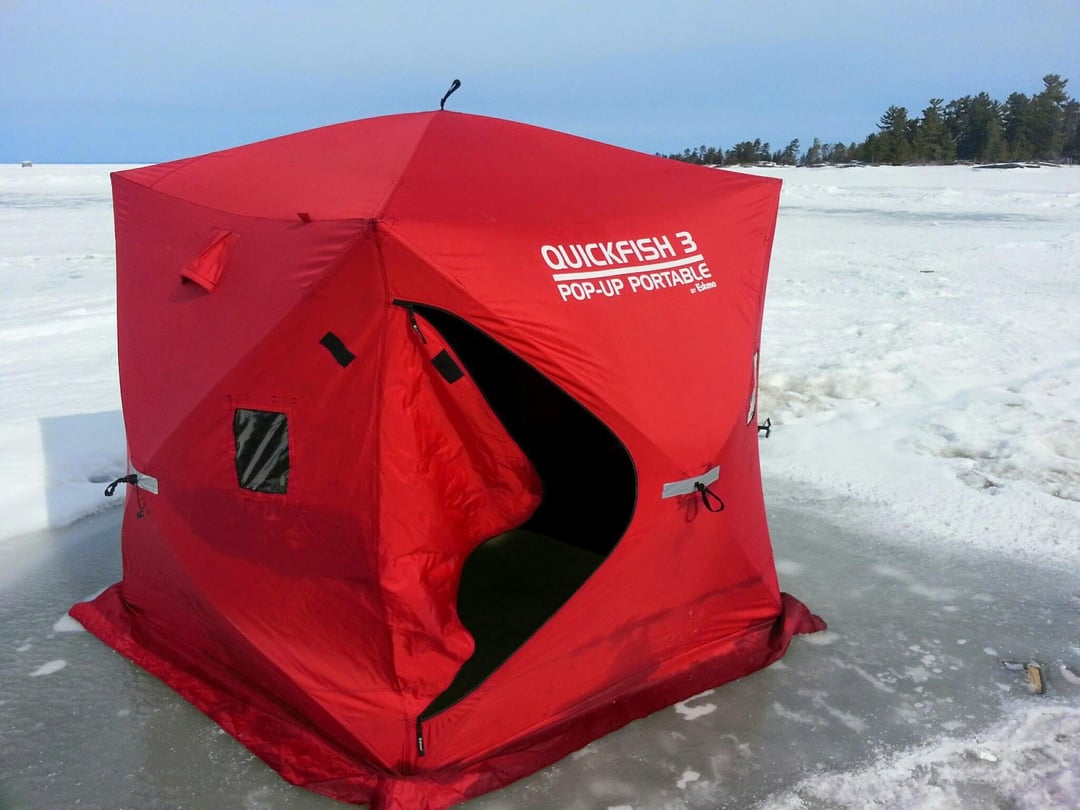 This is an eskimo 4 man pop up, I used a little buddy heater. 4 inch ice Auger that connects to my ryobi. Lightly packed and ready to walk out. Posted by bbrian017
