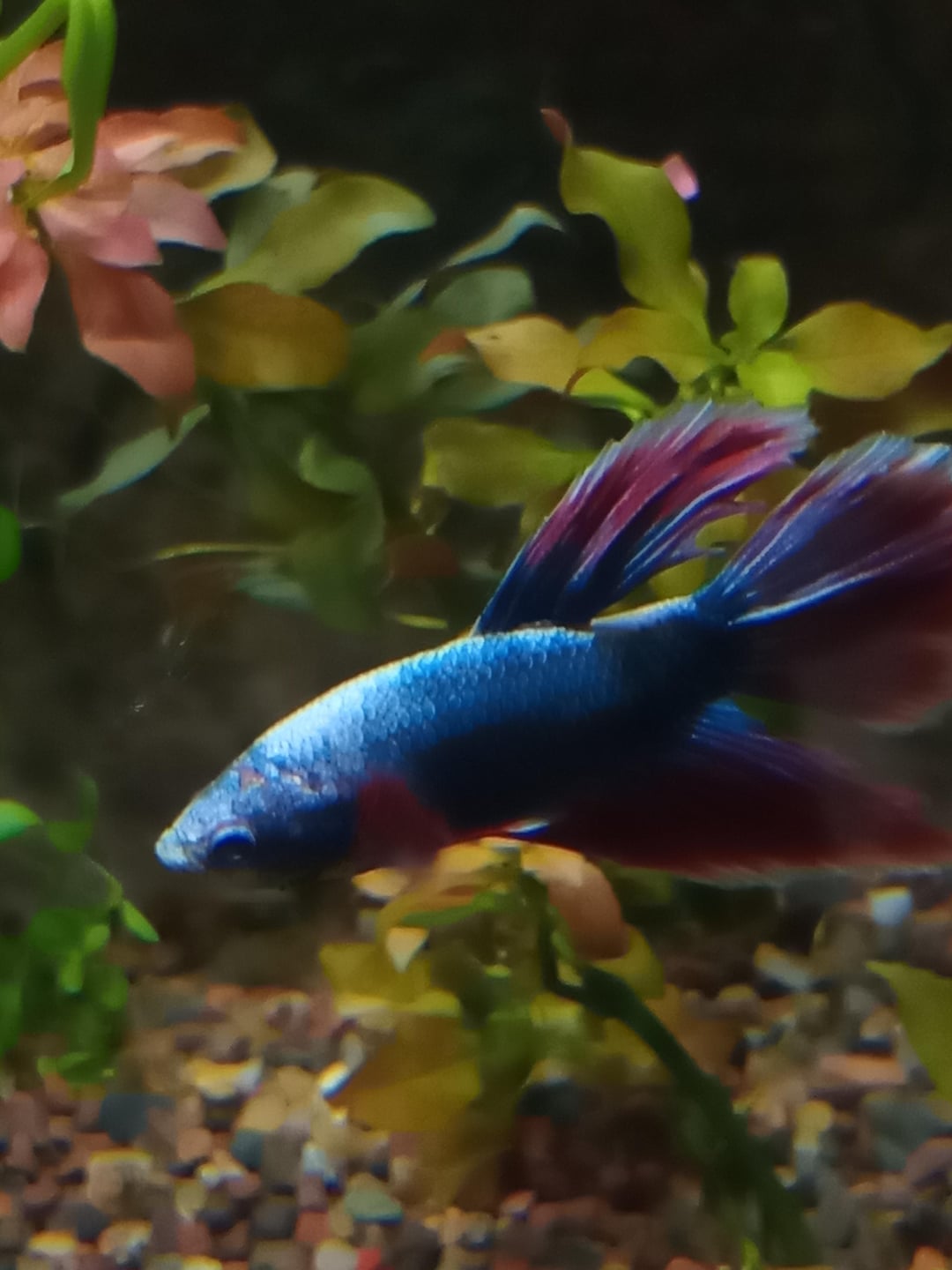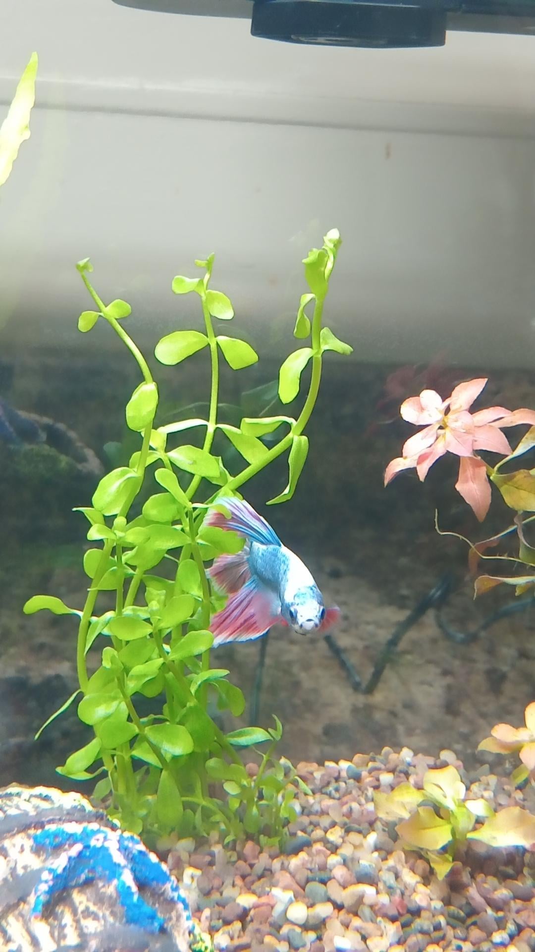I've had a betta in the past named Gouda so this is my first in about a year. He's got a planted 10 gallon with ghost shrimp and a black mystery snail (Gary)😊