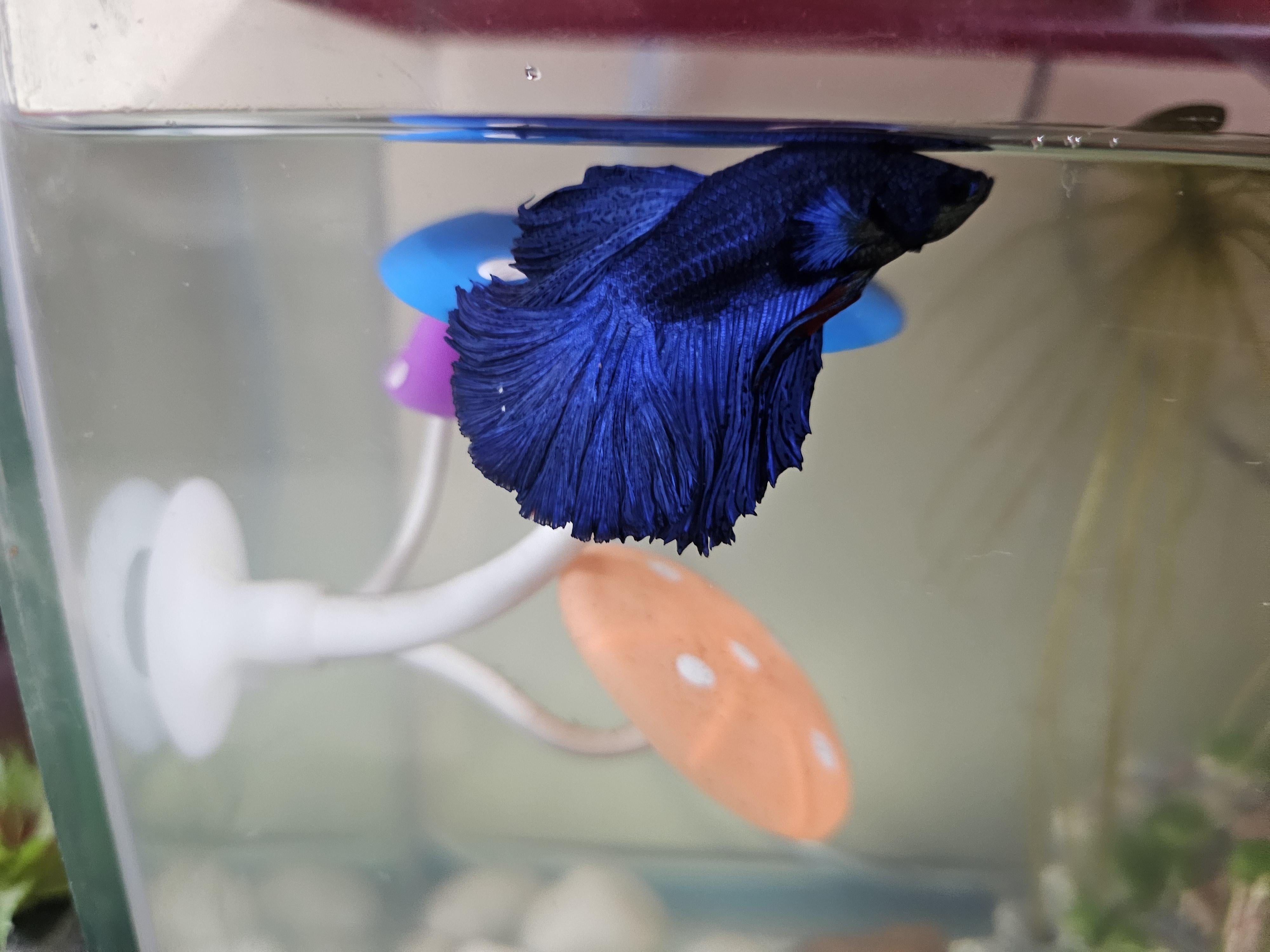 Has a driftwood in the water, 3-4 amazon frogbit (added recently & he started swimming around them within mins), no soil or sand in the aquarium, an artificial mushroom hammock, a small artificial cave type structure for him which he uses, a spong filter (added yesterday).