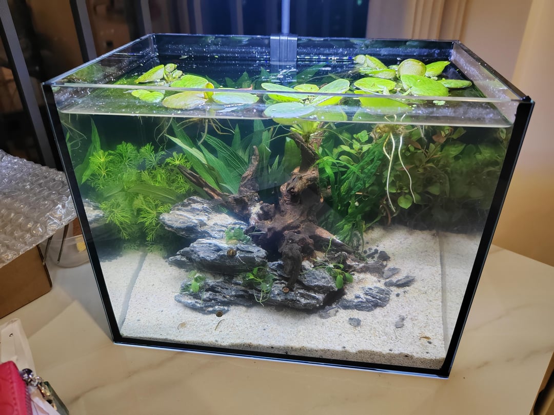 3 days after the setup l added 5 AP suggestions. I will add a few shrimp too, haven't decide on adding a fish yet. Do you have any suggestions for this size?