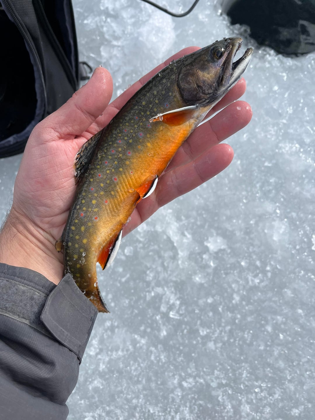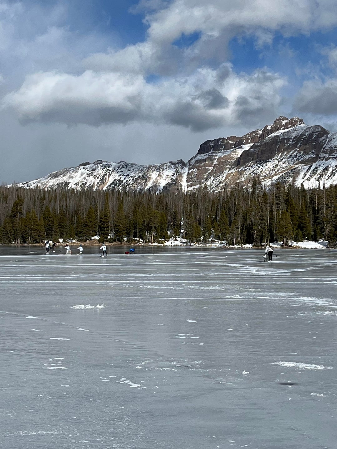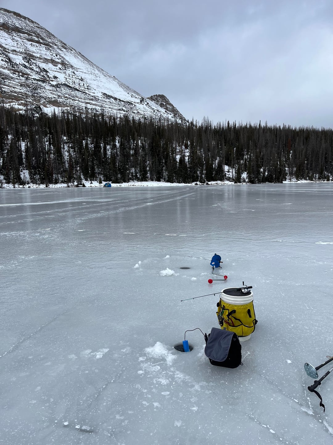 Couldn’t fight the itch any longer. Also wanted to try out my new sonar. So I went to Mirror Lake in the Uinta mountains here in Utah where it has been cold enough for solid ice formation. Caught about a dozen brookies and rainbows on a small red tube jig tipped with a mealworm. There was been a severe lack of snow currently in Northern Utah, but the conditions were right for all the people ice skating and playing hockey.