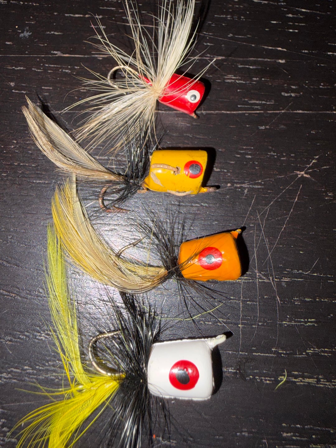 2. The ones with the eyes painted are foam poppers for bass. They are for fly fishing. They work very well
