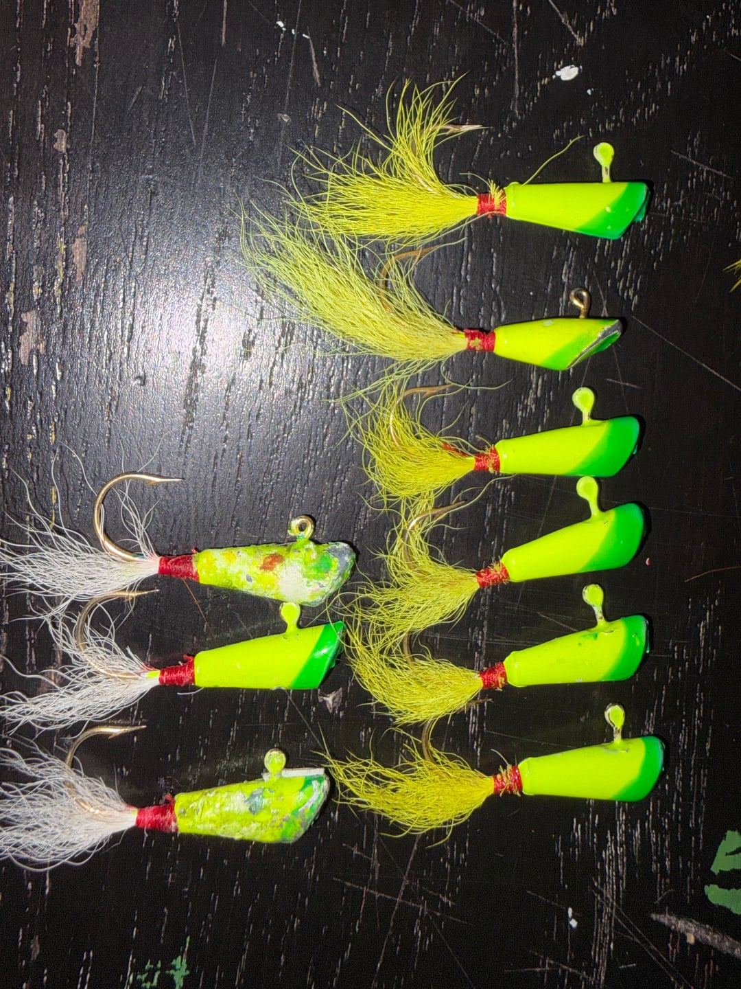 6. As everyone has mentioned the jigs are “shad darts”. They have that slanted face so when you pop the rod tip they will jump sideways as well as up and down to be more erratic in the water than a traditional ball style jig head.