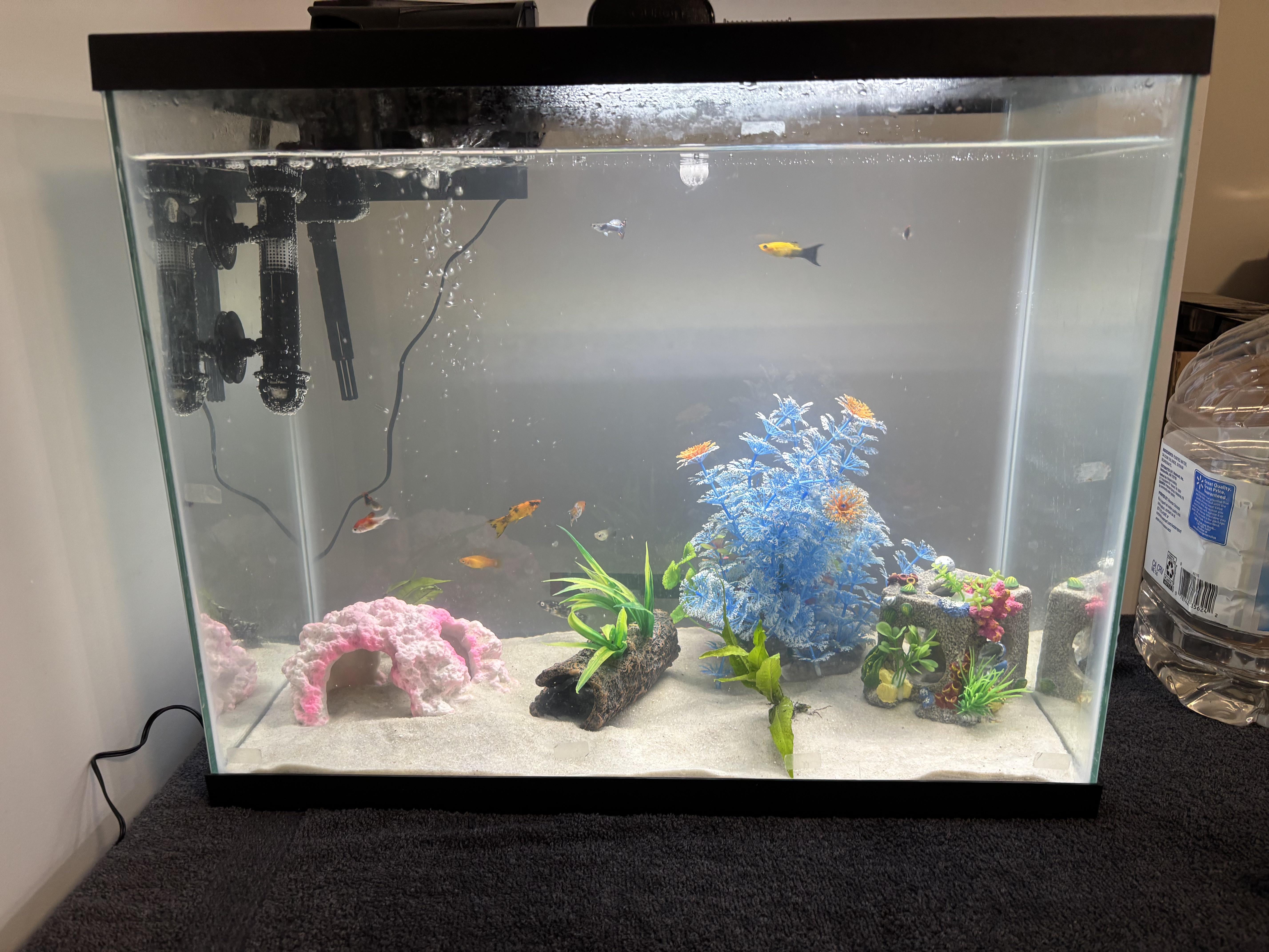 Here’s my first tank since I was a kid set up and added fish today! Water tested great! Filled up and let it sit before adding fish, have couple Mollys,Guppies, 2 goldfish & a Cory catfish, one of my guppies looks pregnant so could be expecting babies soon, ordered a sponge cover for filter protection but any other advice would be helpful to prepare the tank!