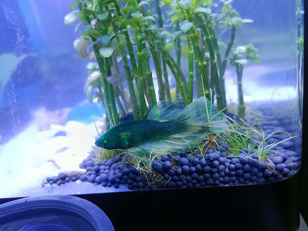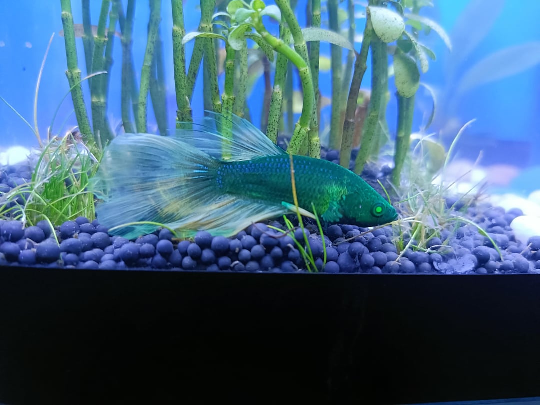 His head is a more uniform green while his body has like blue scales and a weird bright green patch on both sides near his pectoral fins. Fins and tail kind of transparent but also greenish. I think the tail shape is a delta when he flares?