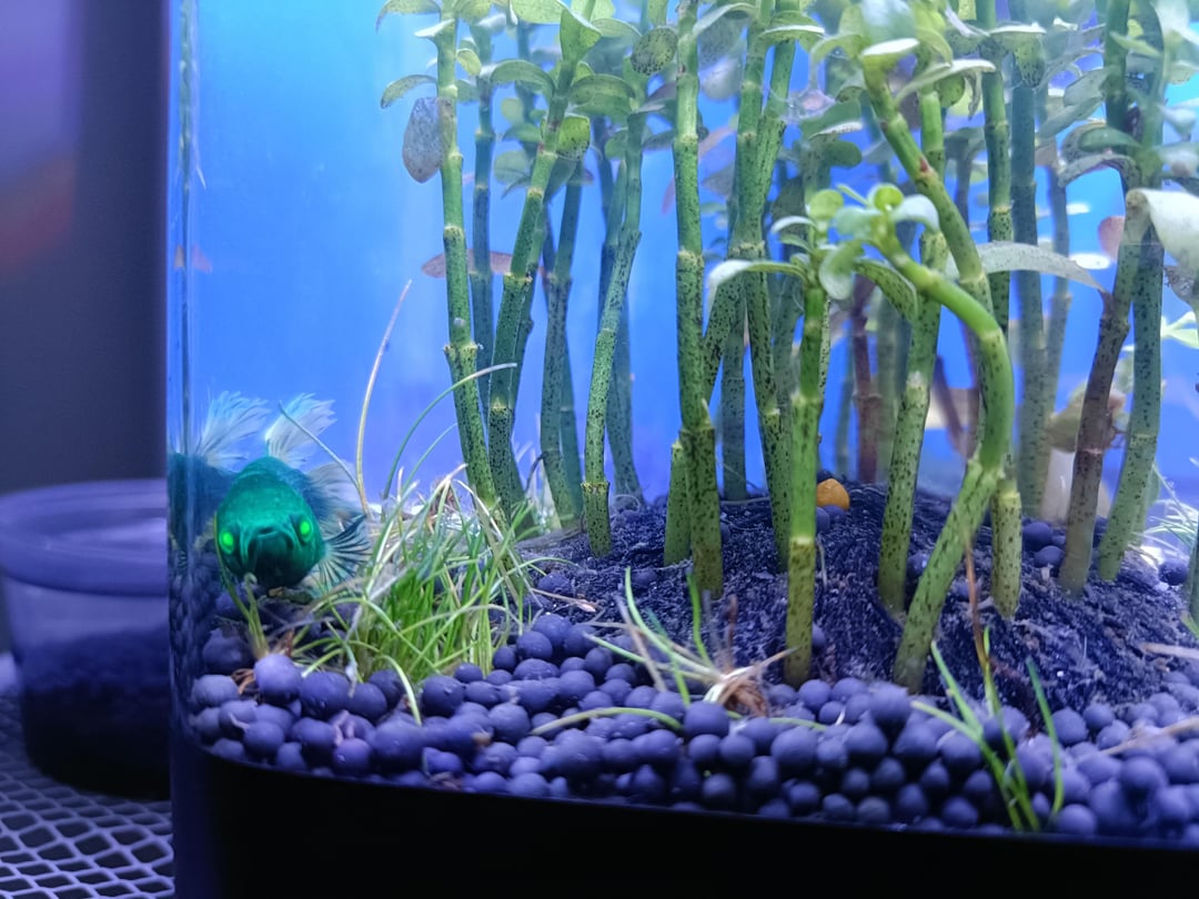 I heard glofish Bettas have green eyes like this. He's not a glofish that turns dull from ill keeping is he? I really hope not because I don't like glofish they look ugly and unnatural. But regardless I'm going to take good care of him now that I got him.