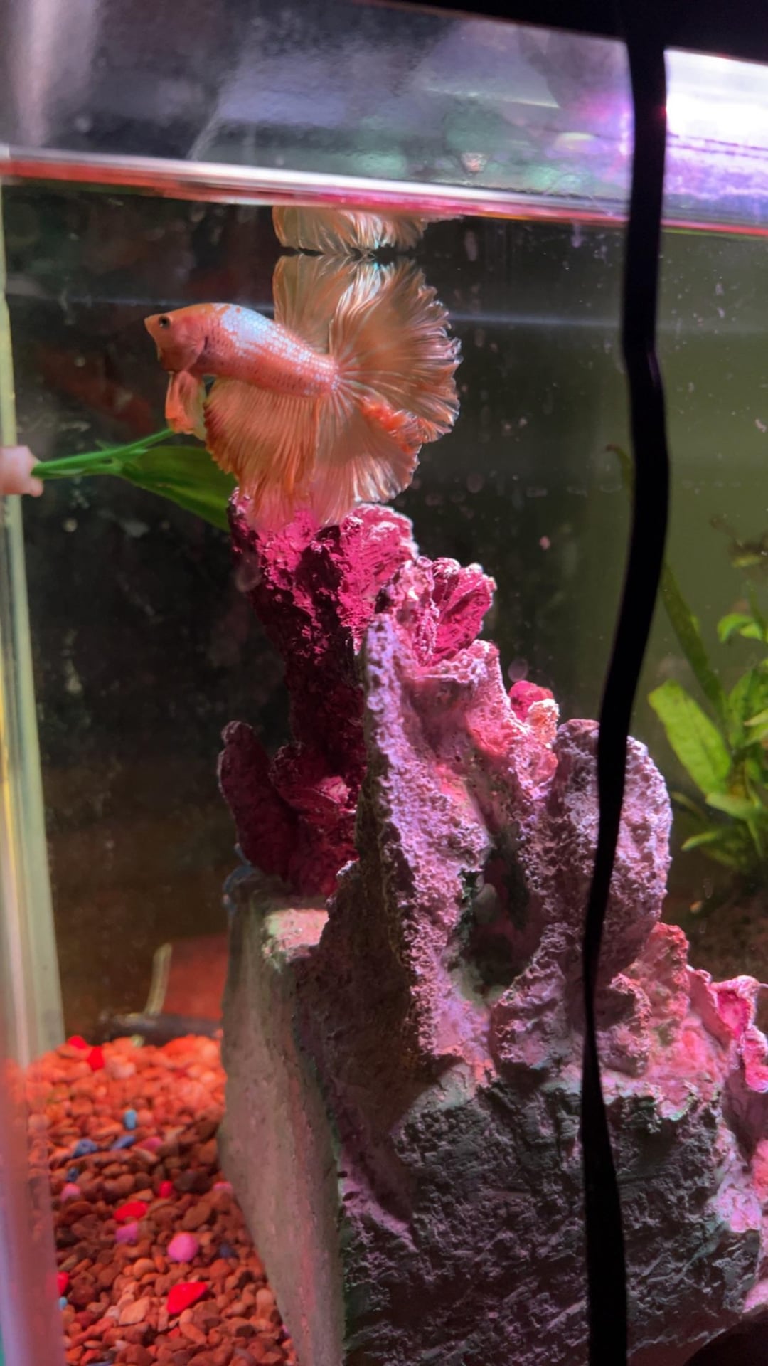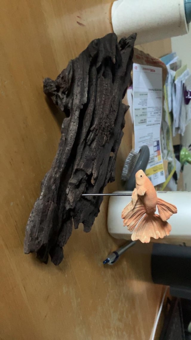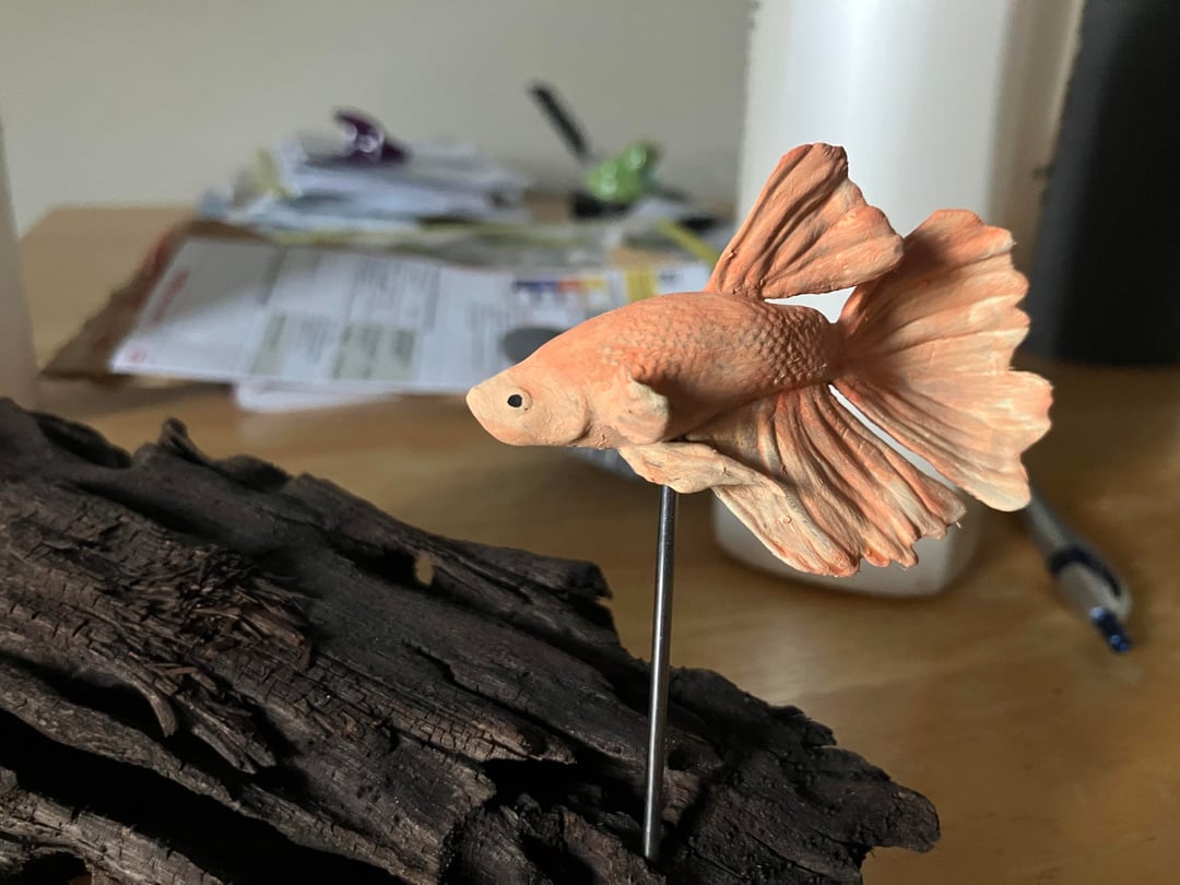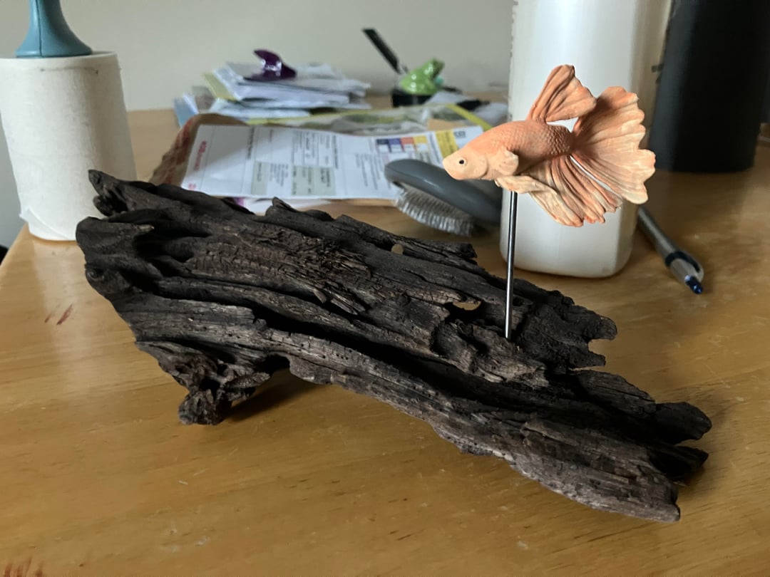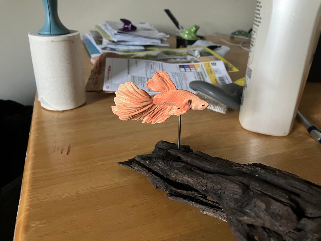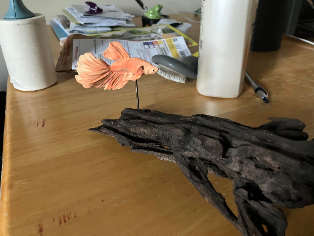 My partner has been heartbroken since her betta Mister Rogers passed away earlier this year, to the point she says she never wants another because he was so special (and I absolutely understand that). To make a memorial of him, I had a 3Dartist friend of mine make a model in Blendr that was as close to his likeness as we could manage. I used my 3d printer to make a physical version of that model, and spent lots of time looking at photos and videos of Mister, and blending paint to approximate his colors and patterns. I used a pice of driftwood as a base, and made a stand from a bicycle spoke. This is my first time doing anything like this, and i am really happy with the result. Now he can live on her desk forever đ„°