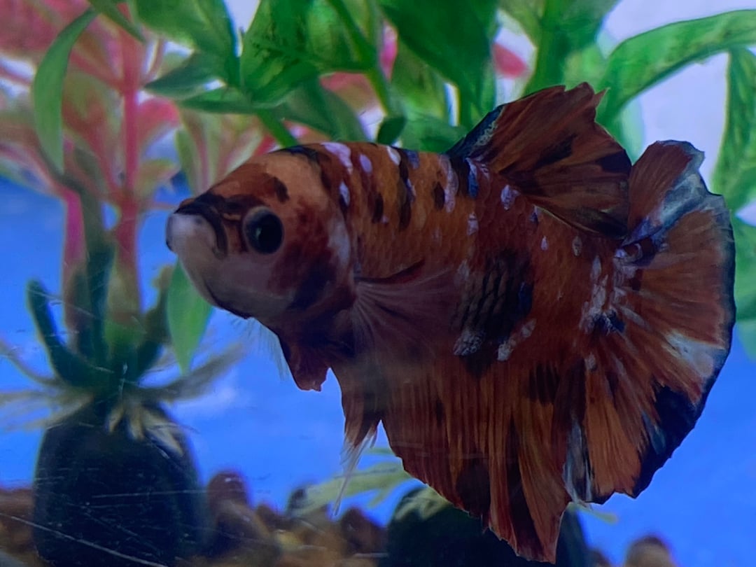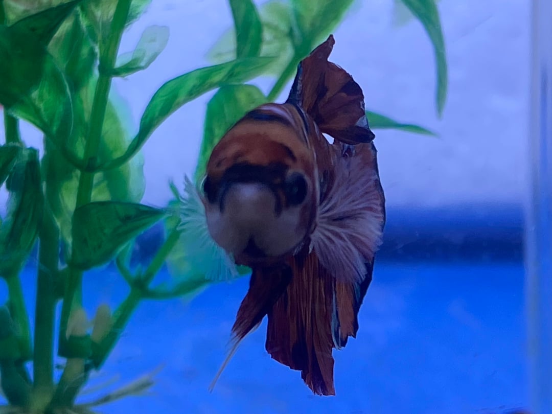 It’s a Plakat – Nemo Koi. And he’s very beautiful 😊. Not rare, but they’re amazing little fish – and more active and less prone to fin problems than long-finned males. He’s a Nemo because his colouring is basically red and orange, with white and black spots. Gorgeous little fish!