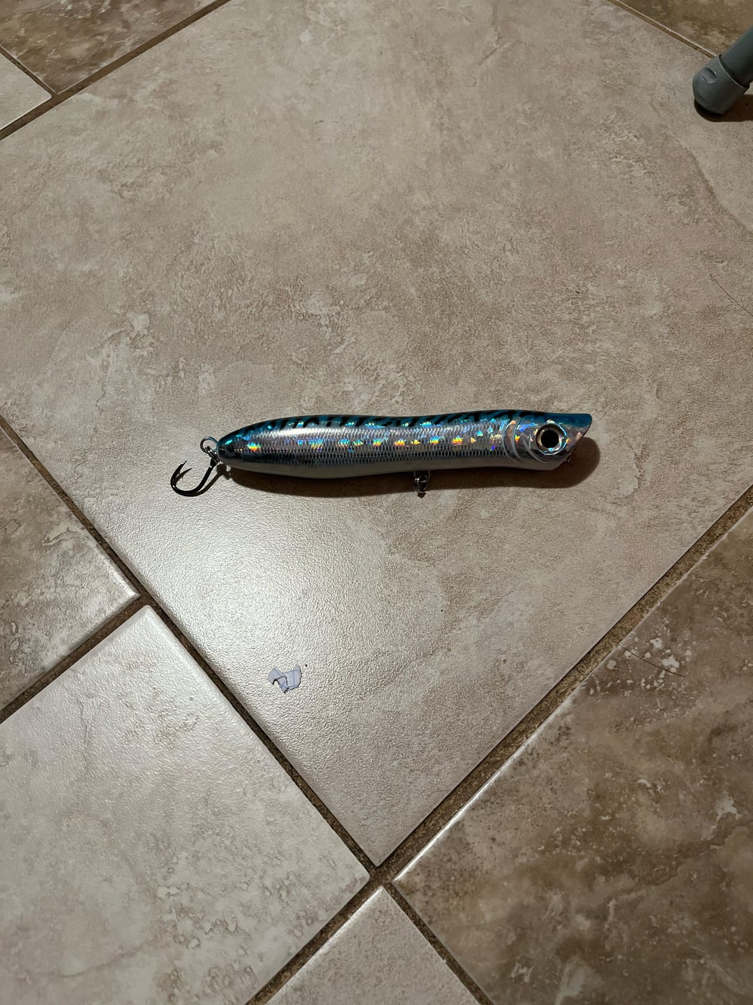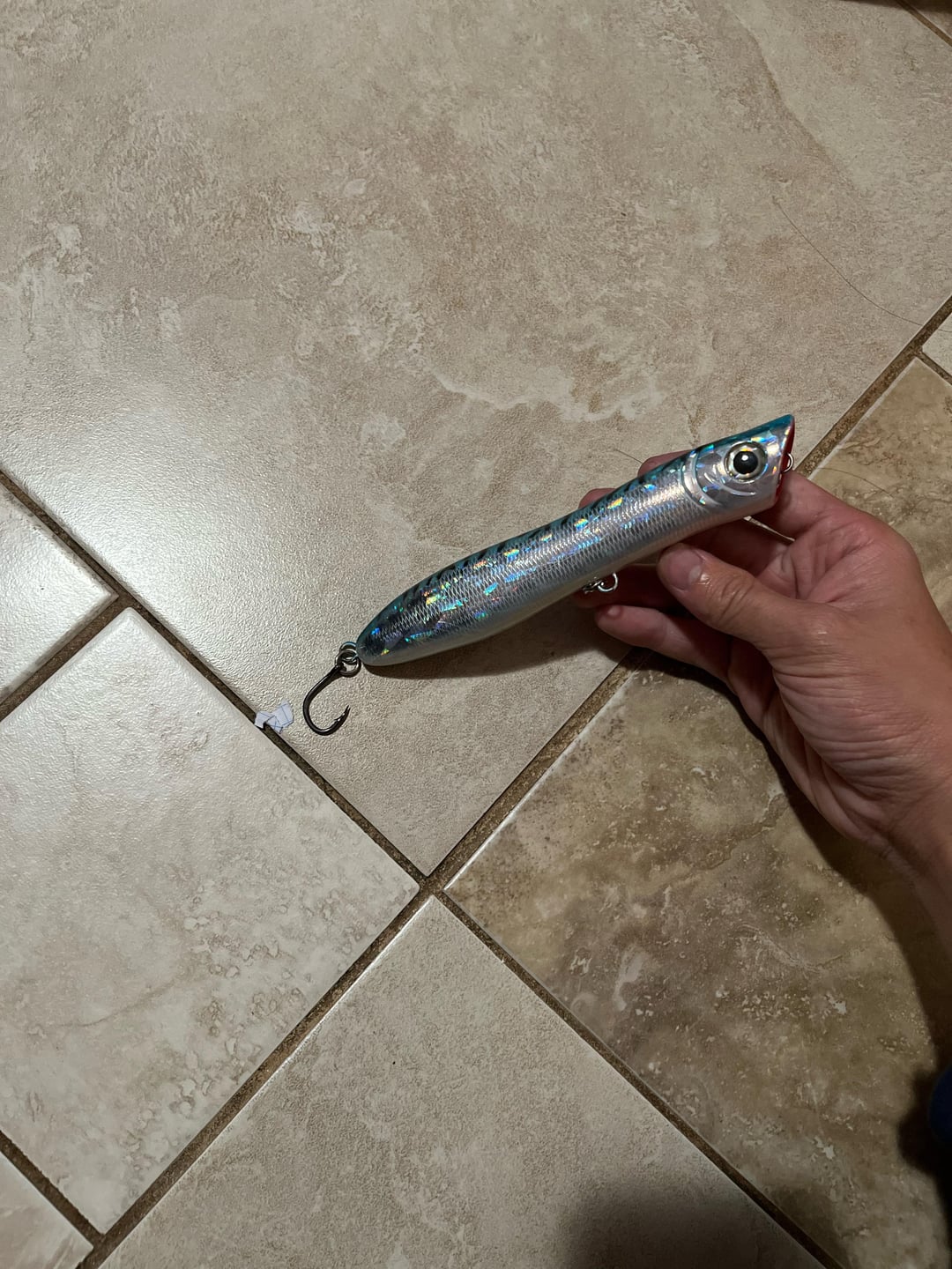 Put my blood, sweat, and tears into putting my hook into a thick split ring and as I got it on, I looked at it to see my masterpiece before realizing it doesn't look right, planning to use this 7 ish inch popper for jacks, posting this so I don't make the same possible mistake for the other split ring and doubling the struggle