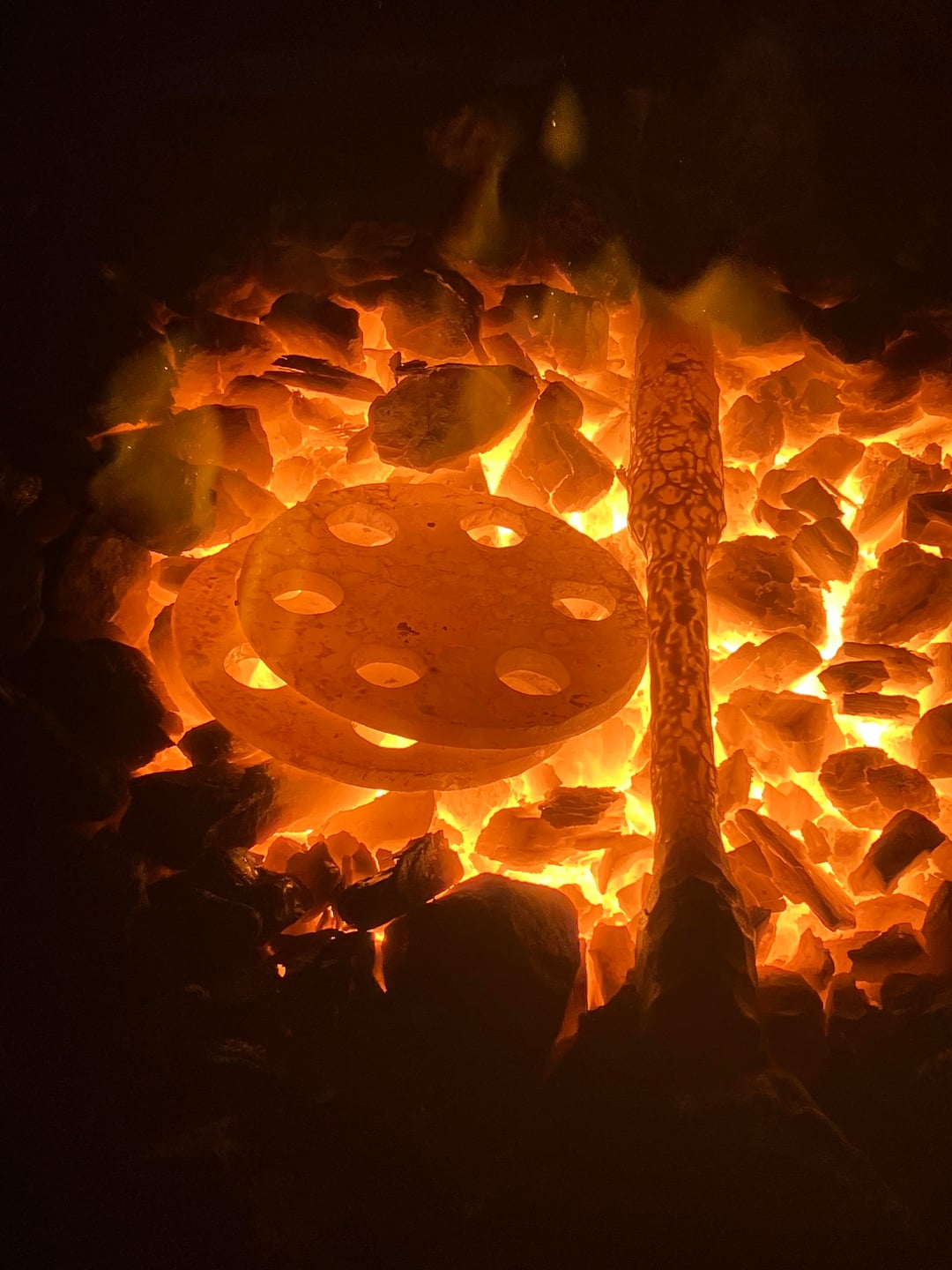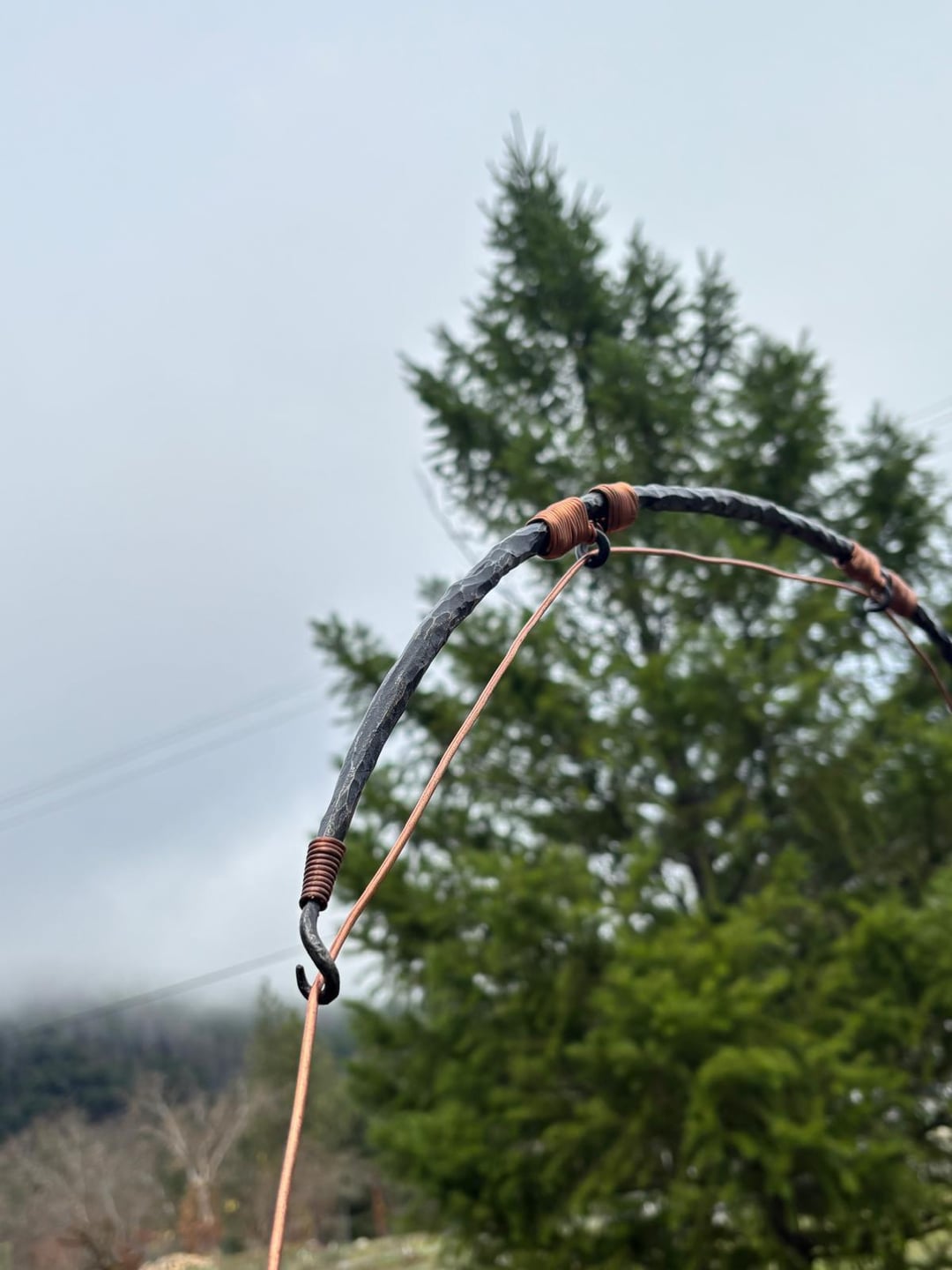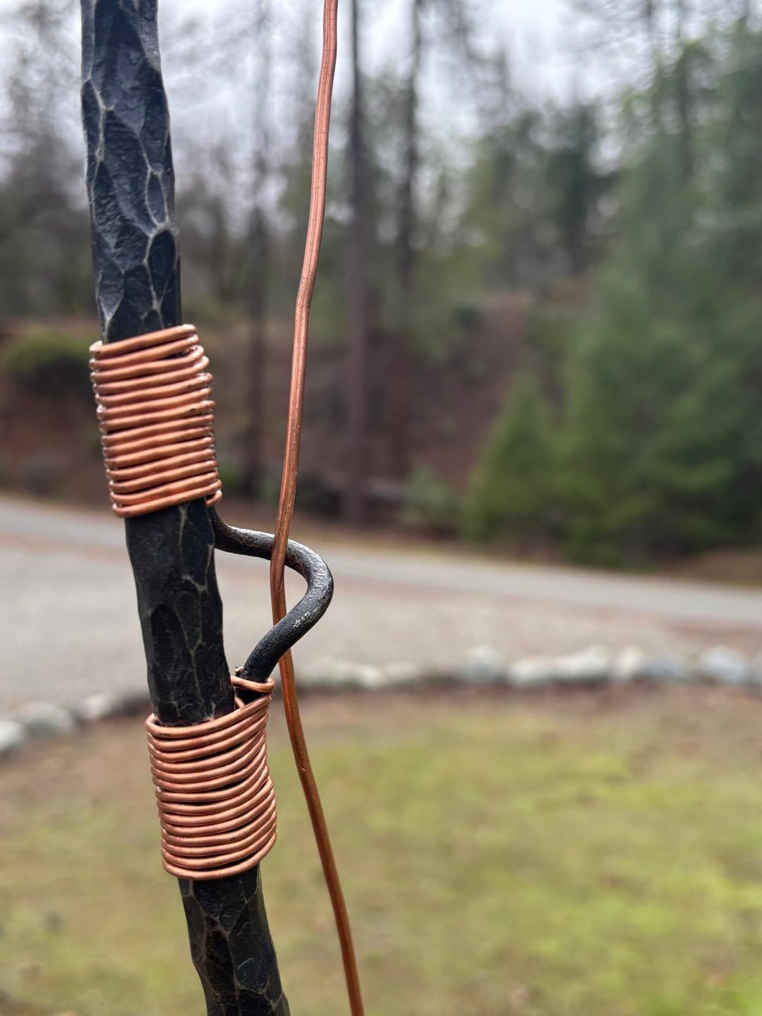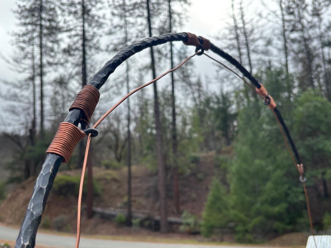 The rod is forged and drawn out from a 4’ piece of 1” round bar. The reel and sign backing were cut and forged from 410 stainless. Copper was used for the rod guide wrapping and the line itself.