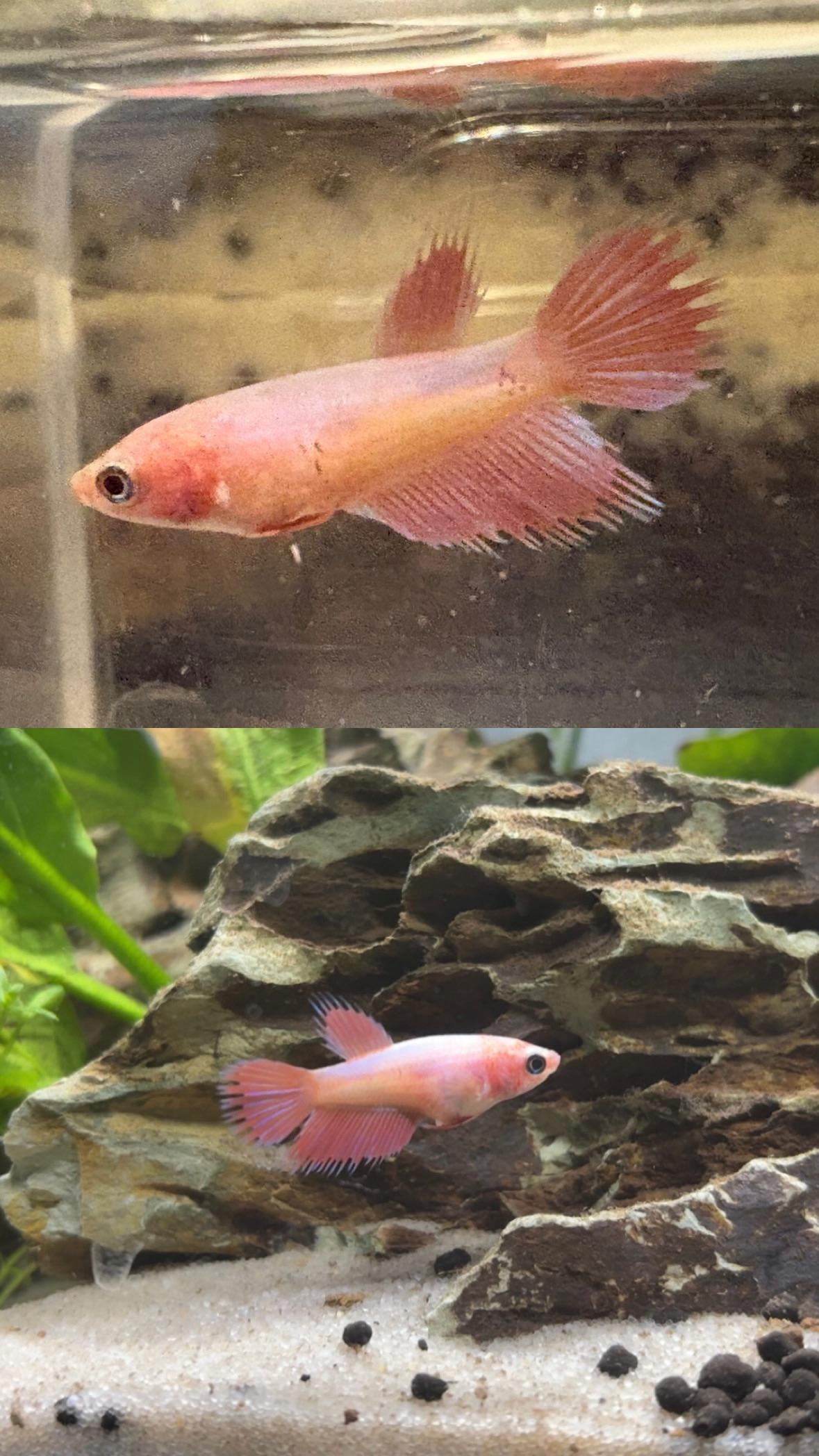 This is my girl. She doesn’t have a name yet (bc I’m scared she’s gonna die suddenly right after I name her). She’s allegedly a crowntail (not sure yet) and I think she might be on the younger side considering just how small she was compared to other females I saw. She also has trouble eating the food (working on getting smaller pellets for her). I’ve had her for four days now, feeding her 1 pellet in the morning and 1 at night. Is she looking a little more pink and like… shimmery to you guys? Or am I just really hoping she’s improving because I’m scared shes gonna die out of nowhere like my last boy.