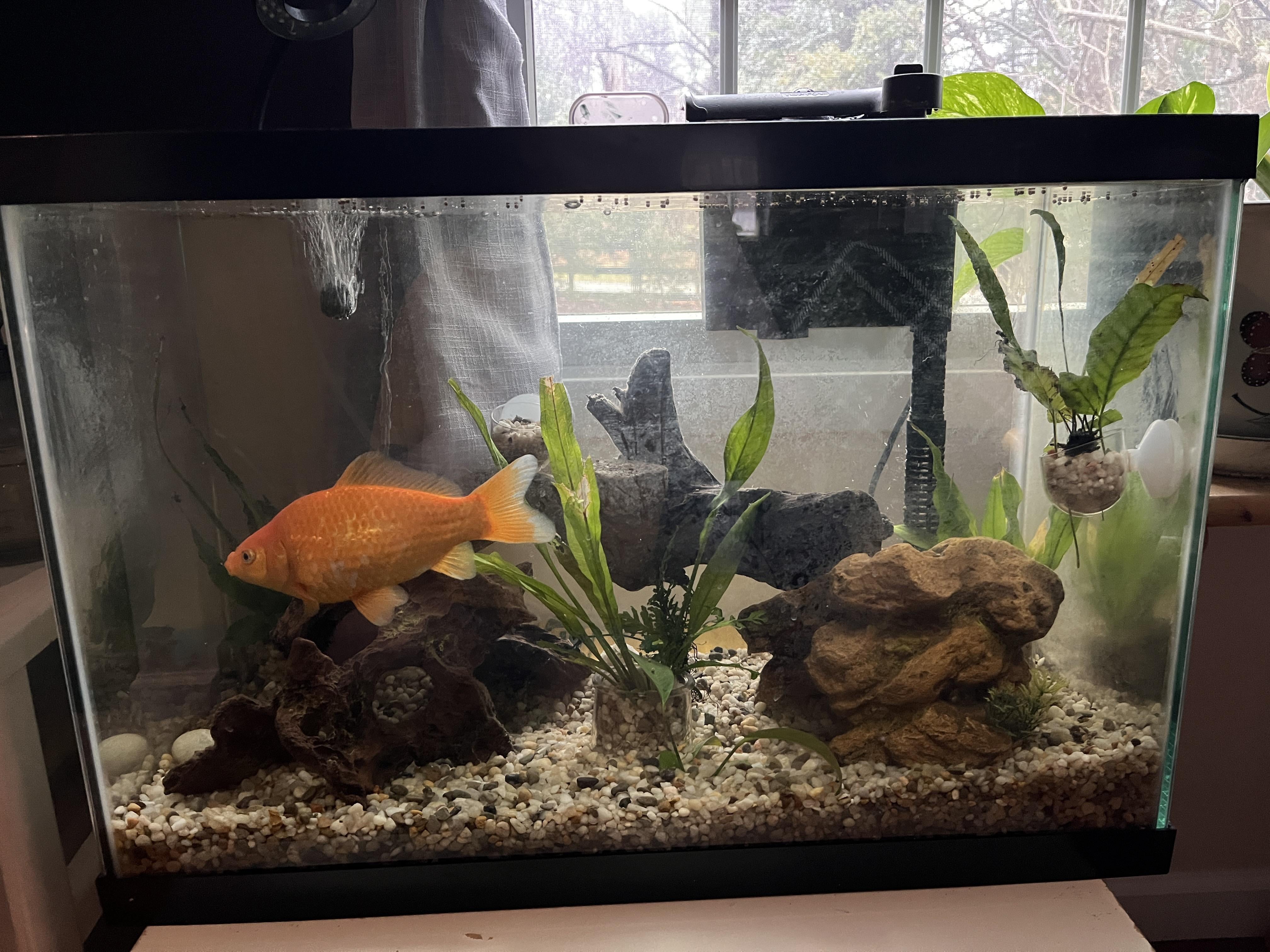 Wow, he’s a survivor! My best advice is to repost in the goldfish sub for tank size requirements. The problem you’re having with plants will probably be solved once he moves out. Liquid fertilizers will be your best bet for java fern. You could switch to a planted tank. Remove everything including substrate. Add an inch of aqua soil and top with sand or fine gravel. That will open up a whole new world of stems, crypts, swords and val. You can add floating plants and more epiphytes if you don’t want to fool with your substrate.