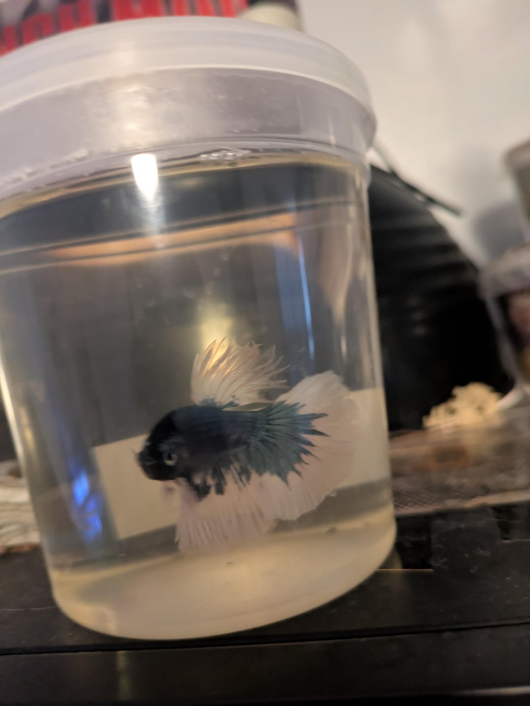 This is my gorgeous guy Sinatra I got 3 days ago from the PetSmart I have a part time job at. He's very interactive and loves attention. I've had a 5.5 gallon low tech planted tank cycling since I got him with about half of its water being from my neocaridina tank. Is it less dangerous to put him in his tank after only a week cycled than to keep him in the cup any longer? He's seems very healthy and I don't want to put him in more danger than I have to.
