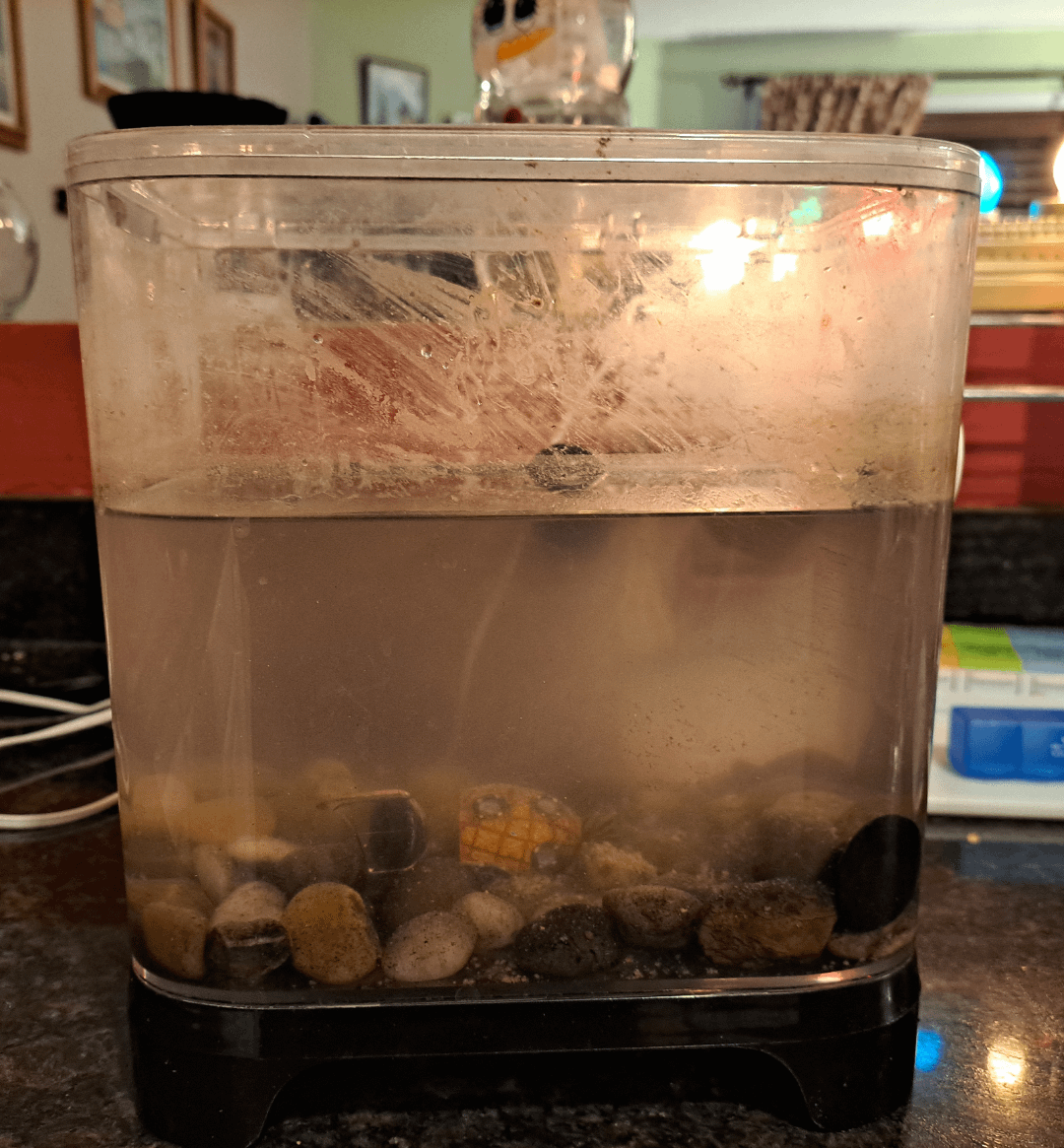 Last year or so, my aunt got a betta fish for her daughter, who was five at the time (you see where this is going). They lived with my grandma but moved out earlier this year. Since then, they dumped the fish on my grandma. I wasn't aware of the condition the fish was in until November 28th. Went to her house for turkey day and nearly gasped at the state the fish was living in. There was nothing but rocks, a heater (which was unplugged, broken with GLASS everywhere) and a nasty spongebob pineapple decor. With hardly any convincing, my grandma gave it to me.