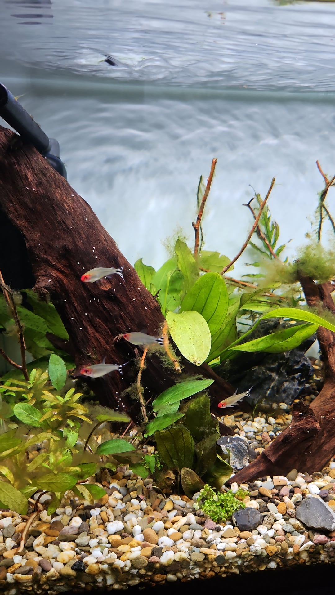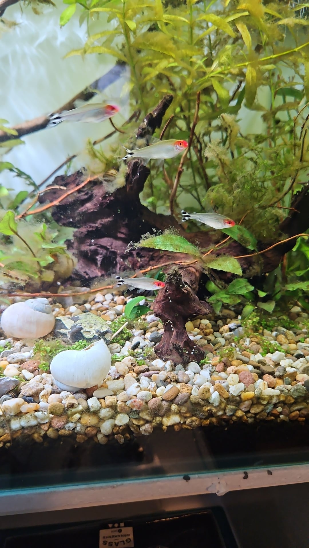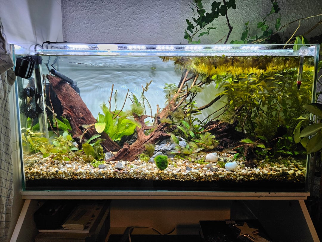 For over 10 years I have been interested in freshwater aquatiums and wanted to have one. Almost got one 7 or so years ago, but had to take it down before i could get any fish in it. So having this 20 g, with 6 rummy nose, zebra snails, 2 armano shrimp and 2 elephant snails. Is a dream come true. Might add some Otocinclus affinis soon and some red shrimp. Also fighting the MTS daily, i don't have space for more 😆