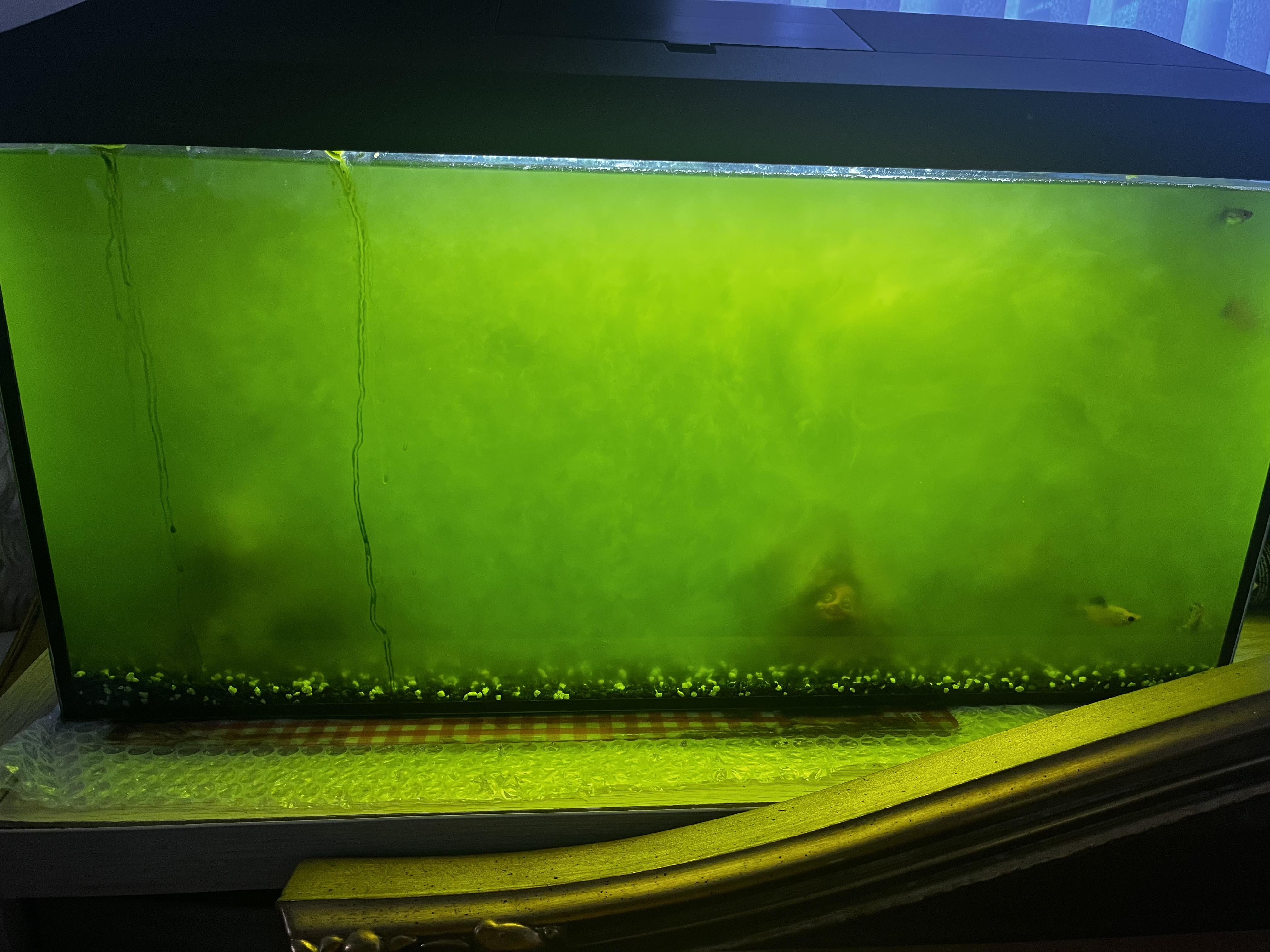 So i am in no ways an expert on aquariums. But when i visit my grandma her aquarium always looks like this and i dont get it… she told me she cleans it every week (stones and decoration) but the algae growth is insane. Now this tank is for simple fish (mainly guppies) but i dont think she either needs a more powerful filter or maybe some plants? Also dont mind the creepy face its just an old finding nemo decoration. Also for your information the algae seems too be very liquid-ish not like clumped up together river algae.