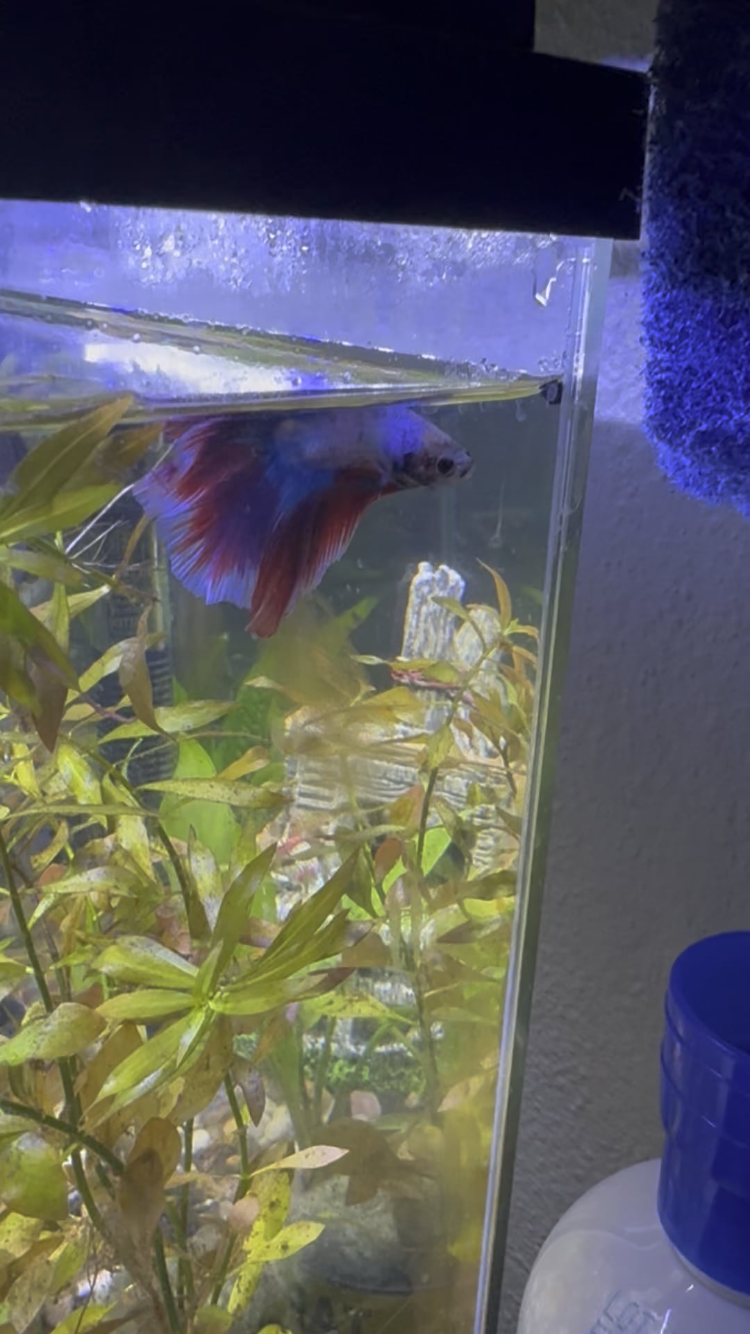 Hi! New betta owner here. We’ve had this fish for a week and a half. Didn’t notice anything odd when we purchased him but when we transferred him to the tank we noticed he was floating at the top and appears to have some swelling near his tail. ChatGPT has been helping me troubleshoot, but we’re still having issues (see video for progress today). Not sure if he’s ill or if it’s just a pressure issue. I’m not feeding him every day, but when I do he eats eagerly. He will try to swim down and will lodge himself under a leaf, but can’t stay down unless he’s under something. He likes to hang out in the betta hammock and floating log. He responds to interaction, so he seems lively and not sickly to me, but I really don’t know what I’m doing. I also got two nerite snails that have not moved since we got them (he was feisty with them at first but eventually lost interest).