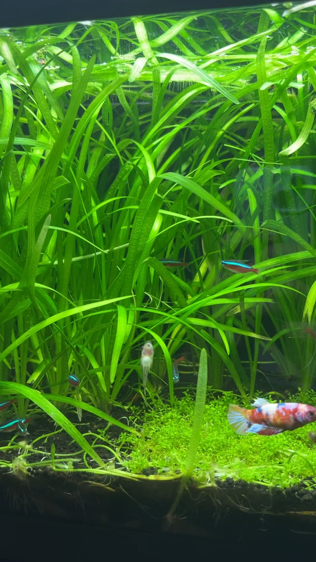 Just figured I’d talk about Funfetti a bit (lookup funfetti on google if you’re confused on her name lmfao). Anyway she came in rough condition, but since I got her, the colours have popped SO much, and she gained so much personality. Most times when I randomly check on the tank, she is watching the shrimp or resting on the plants near the surface. Whenever anyone is near the tank, she always goes crazy and tries to get all the attention. I love her! She’s been nothing but peaceful, and everyone in the community does their own thing. Shrimp colony has exploded, and no fighting ever. Ugh, I could sit in front of the tank for hours (I have already who am I kidding)