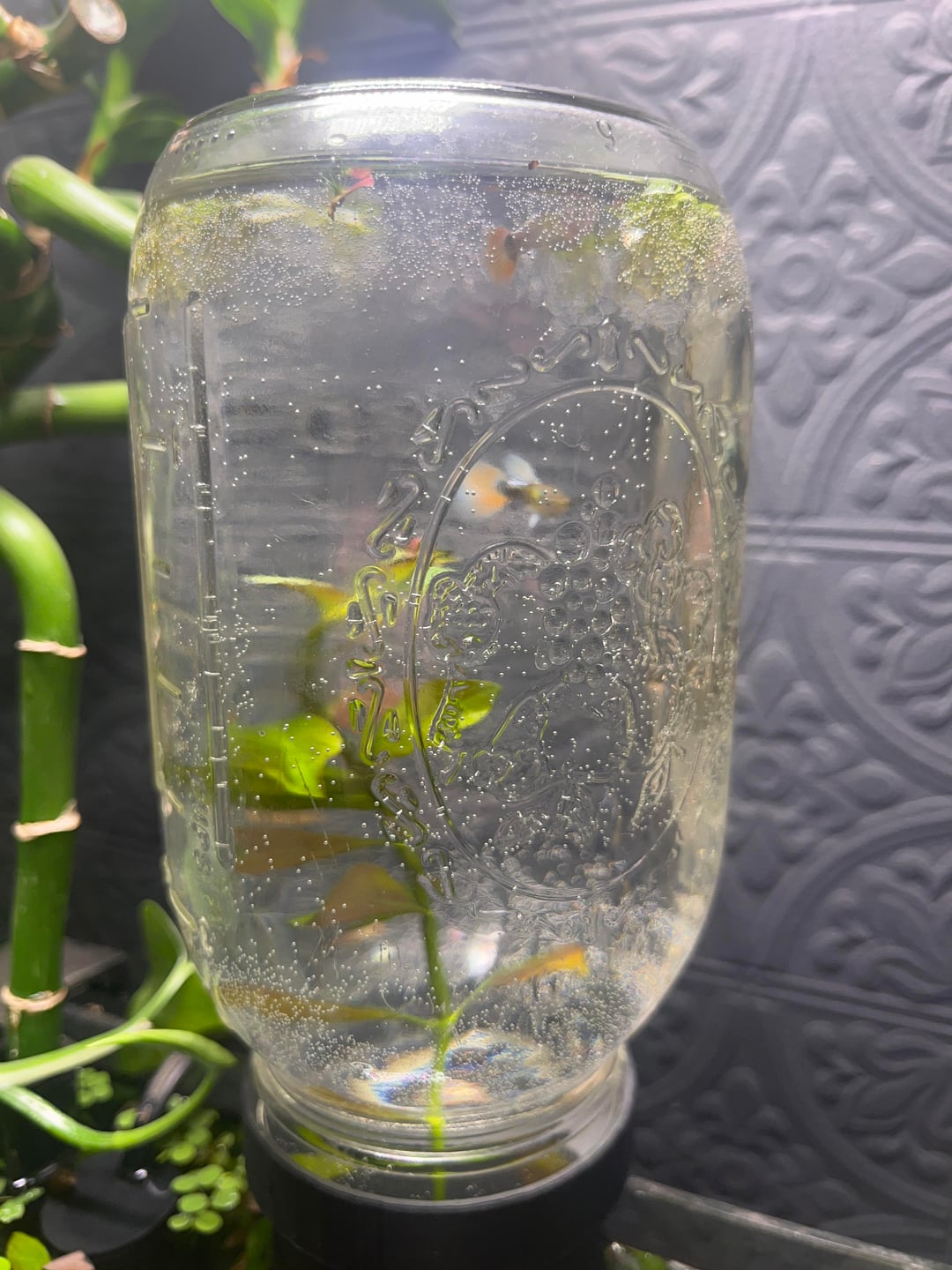 The jar sits inverted on a custom printed mount and replenishes water as it evaporates — no pumps, no floats, no power. Just atmospheric pressure doing its thing. When the tank level drops, water feeds in automatically until it reseals.