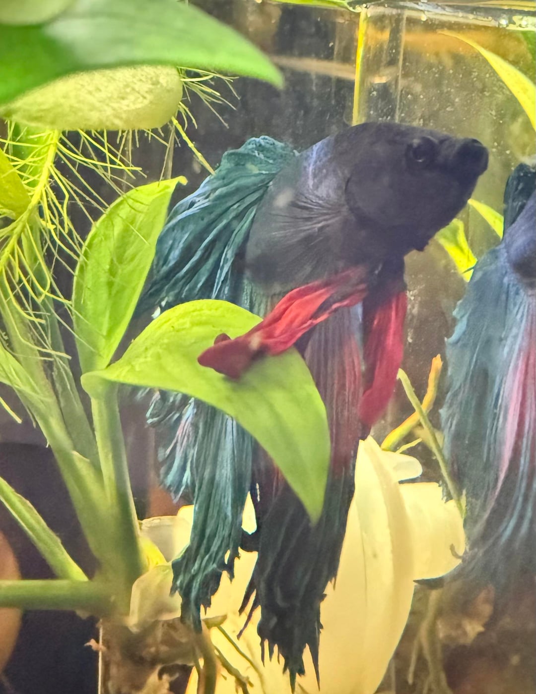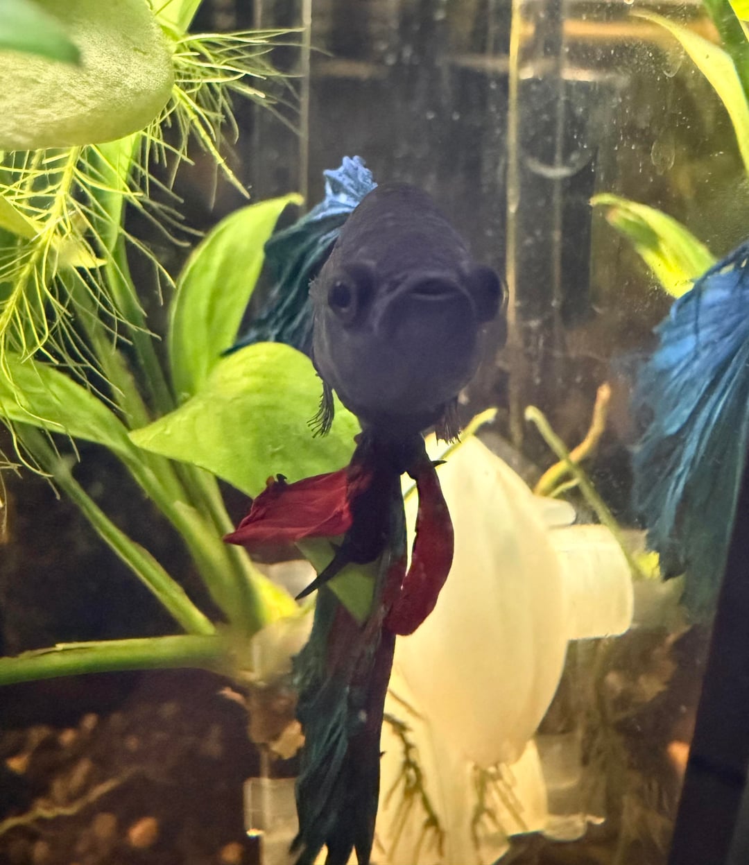 Warren “Heavyfins” Beatty has been with us for a little more than 3 months. His fins were this way when he came to us and while they haven’t gotten better, they also haven’t gotten worse. I’ve been “treating” with regular maintenance, tannins, and monitoring, but the other day I witnessed what I suspected was going on: he’s nipping his own fins. It seems to happen when he’s maneuvering around and can’t quite turn fast or sharp enough, he bends back and takes a bite.