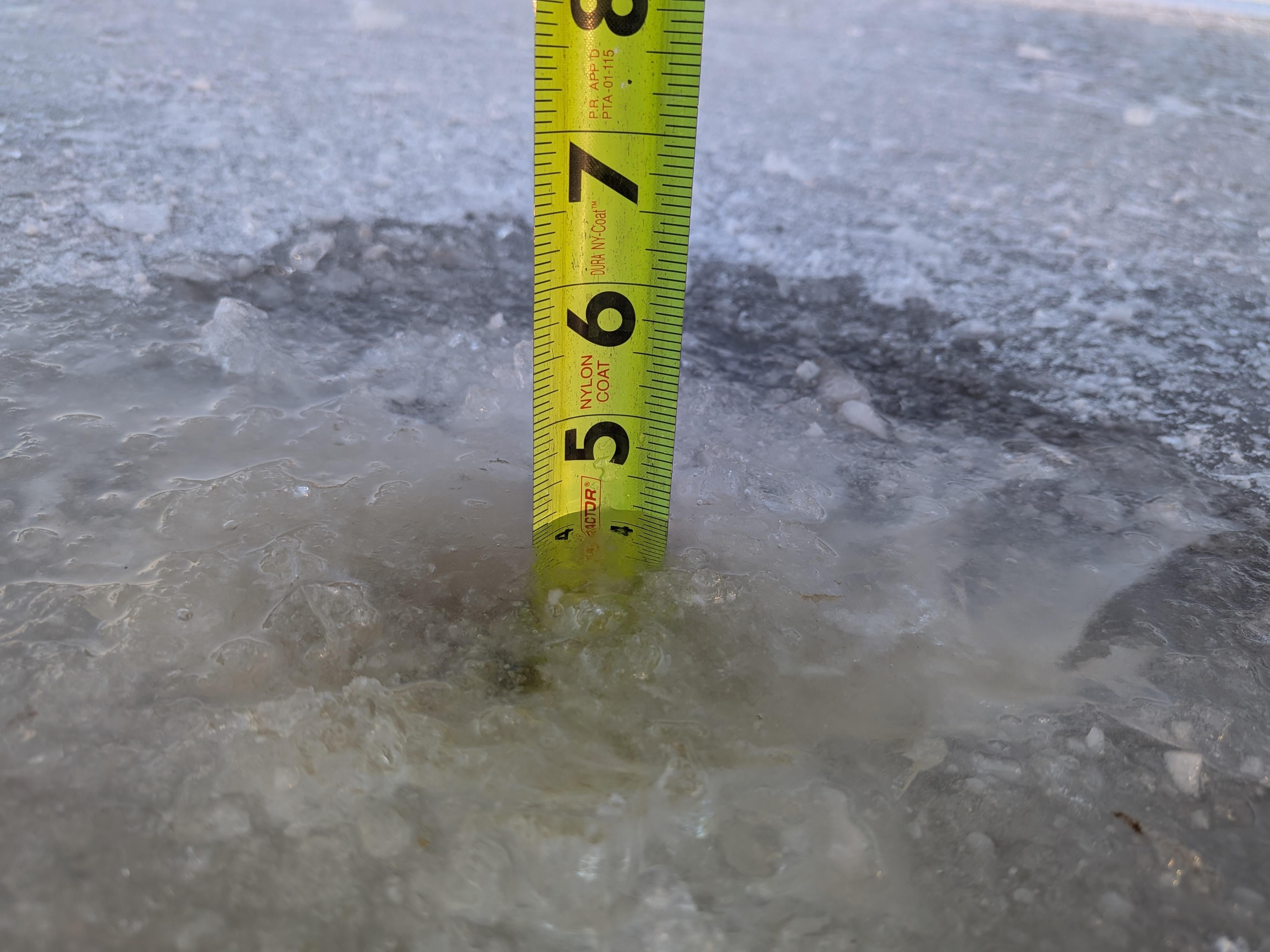 Reports around me are 1.5-3.5 before last nights deep freeze. I’ll be poking around tomorrow looking for 4+ to fish on.