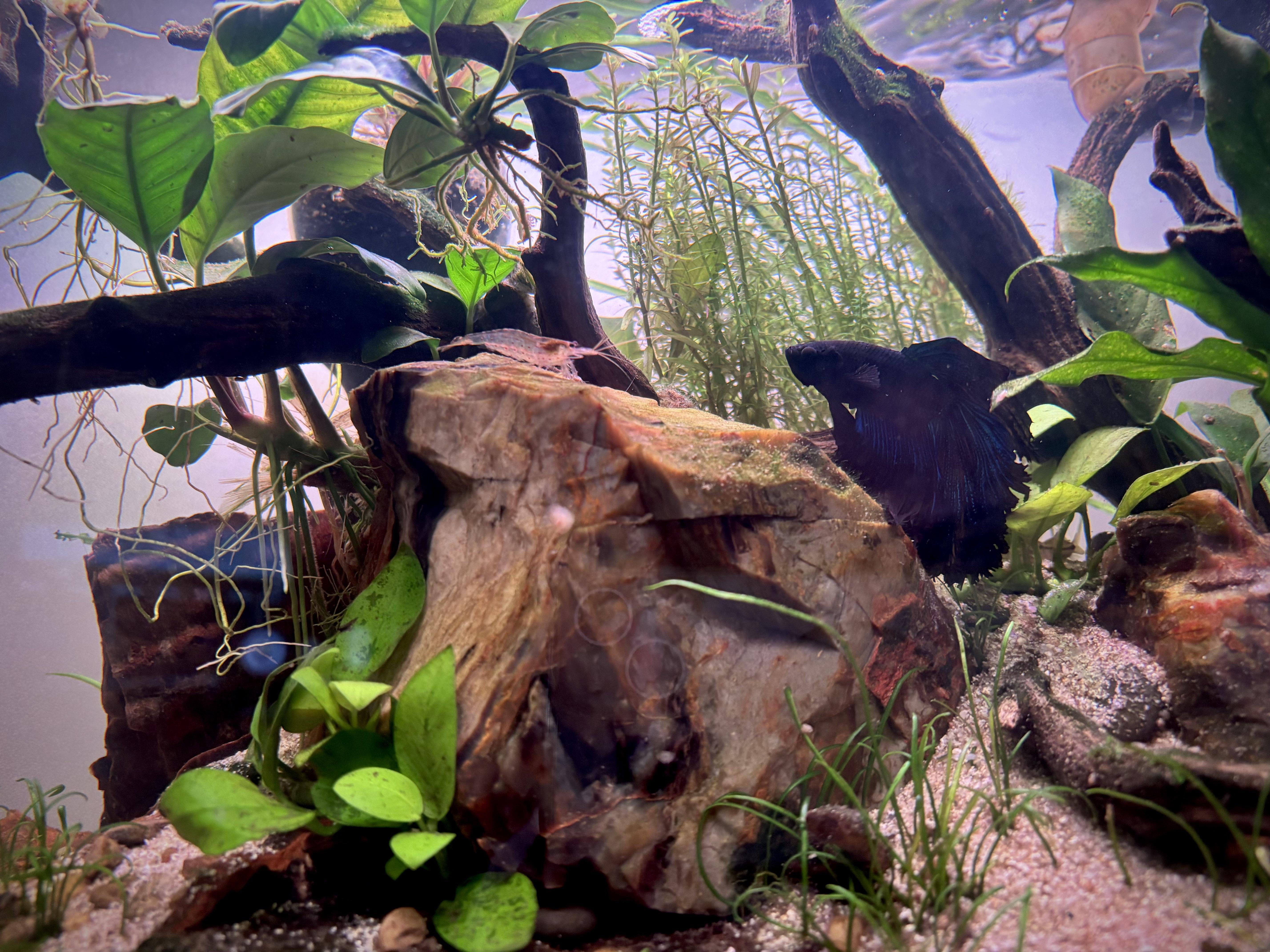 Introduced an Amano to my Luna’s 10 gallon planted tank to help with algae. Observations: rude yet peaceful Betta behavior 🥹🥰