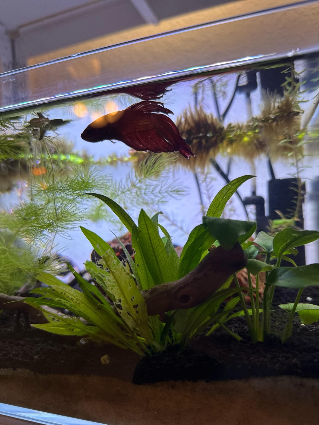 As you can see in the photos, he’s recently developed HOLES in his fins. It looks like it could be fin rot, but the water quality of this tank is consistently good??? Also his coloring is off, he is normally really vibrant cherry red but his head is getting very dark all of the sudden, seeing some flaws and patchiness in his scales.